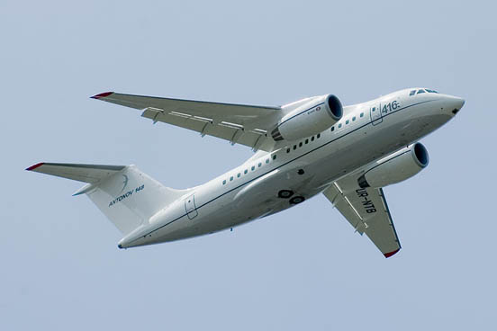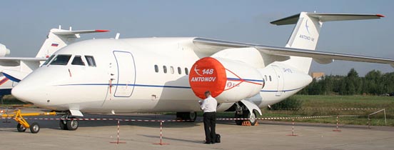 The Antonov An-148 (Ukrainian: Антонов Ан-148) is a regional jet aircraft designed by the Ukrainian aircraft firm Antonov. In December 2006 the An-148 completed certification testing and on February 26, 2007 received its type certificate with the Motor Sich D-436-148 enginesand AI-450-MS Auxiliary Power Unit, a variant of the -9 APU series , from the Interstate Aviation Committee Aviation Register (IAC AR). There are plans to certify this airplane according to Joint Aviation Authorities JAR-25 standards, as the existing certification have already been designed to meet the ICAO Ch. 4 (noise and environmental requirements) as well as the established Western European airworthiness rules . An-148 is currently produced by Kyiv Aircraft Plant AVIANT, Ukraine, and Voronezh Aircraft Production Association, Russia. Ukrainian Aerosvit Airlines started using An-148 at regular flights on 2 June 2009. DesignThe An-148 aircraft is a high-wing monoplane with twin jet turbine engines mounted in pods under the wing. This arrangement protects the engines and wing structure against damage from foreign objects (FOD). A built-in auto-diagnosis system, auxiliary power unit, high reliability, as well as the wing configurating allow the An-148 to be used at poorly equipped airfields. Modern flight and navigation equipment, multifunctional displays and a fly-by-wire system enable the An-148 aircraft to operate day and night, under IFR and VFR weather conditions on high density air routes. The An-148 cockpit features five 15 cm by 20 cm (6" by 8") LCDs built by Russia’s Aviapribor and fly-by-wire flight controls (using technologies developed for the An-70 cargo transport) Variants