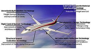 The Mitsubishi Regional Jet (MRJ) is a passenger jet aircraft seating 70-96 passengers to be manufactured by Mitsubishi Aircraft Corporation, a partnership between majority owner Mitsubishi Heavy Industries and Toyota Motor Corporation. The aircraft program is expected to be launched in early 2008. It would be the first airliner Japan has designed and produced domestically since the NAMC YS-11 of the 1960s. Design and developmentThe MRJ will be the launch platform for Pratt & Whitney's PW1000G Geared Turbofan engine. The aircraft is expected to be the first regional jet aircraft to adopt composite materials for its airframe on a significant scale. A cabin mockup and a scale model was presented at the 47th Paris Air Show in June 2007.The company has decided to formally offer the aircraft for sale to potential customers. Production is planned to begin in 2012. All Nippon Airways is the first customer, with an order for 15 MRJ 90s, and an option for 10 more. VariantsSix versions are planned using two different fuselage lengths. The MRJ70 will have a passenger capacity of 70-80 and the MRJ90 will have a passenger capacity of 86-96. OrdersAll Nippon Airways: 25 aircraft. SpecificationsSources: MRJ Aviation Week See alsoComparable aircraft