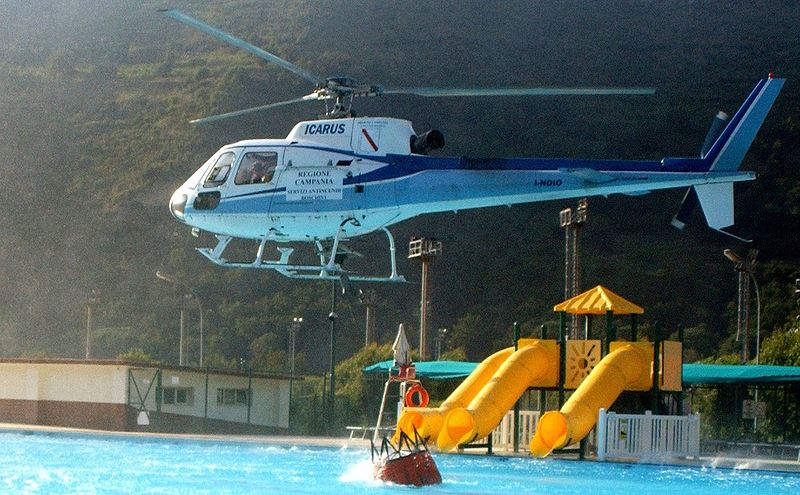A Eurocopter AS350 dips its bucket into a swimming pool before returning to drop the water on a wildfire outside of Naples, Italy |