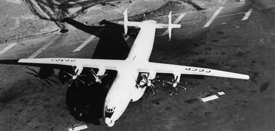 Antonov An-22 Antei (Russian: Антей (Antaeus) (NATO reporting name "Cock") was the world's largest aircraft, until the advent of American C-5 Galaxy and later the Soviet An-124. Powered by 4 contra-rotating turboprops, the design remains the world's largest turboprop-powered aircraft. It first appeared outside the Soviet Union at the 1965 Paris Air Show. Design featuresThe aircraft was design as a strategic airlifter, designed specifically to expand the capability of the airborne troops to land with their then-new BMD-1 armoured vehicles. The An-22 cargo hold can accommodate four of these as opposed to one in the An-12. It also has the capability to takeoff from austere, unpaved and short airstrips, allowing airborne troops to perform air-landing operations. This is achieved by four pairs of contra-rotating propellers, similar to those on the Tupolev Tu-114. The engines generate significant thrust, and produce a slipstream over the wings and large double-slotted flaps. The landing gear is ruggedized for rough airstrips, and, in early versions, tire pressures could be adjusted in flight for optimum landing performance, although that feature was removed in later models. The An-22 follows traditional cargo transport design with a high-mounted wing allowing a cavernous cargo space of 33m in length and a usable volume of 639m³. The forward fuselage is fully pressurized and provides space for 5 to 8 crew and up to 28 passengers, but the cargo space is pressurized to only 3.55 PSI / 0.245 bar allowing for a lighter airframe. A door equipped pressure bulkhead is located at frame 14, separating the cargo attendant's compartment from the main cargo compartment. This allows the rear cargo doors to be opened during flight for paratroops and equipment drop. Like the An-12, the aircraft has a circular fuselage section. The An-22 has set a number of payload and payload-to-height world records. The An-22 has the general appearance of an enlarged version of the earlier Antonov An-12 except that it is fitted with a twin tail. This gives the An-22 better engine-out performance, and reduces height restrictions for hangars. Also of note are large anti-flutter masses on the top of each tail. Only one production variant was built, the standard An-22. Prototypes, such as the one first featured at the 1965 Paris Air Show had fully-glazed noses that lacked the nose mounted radar of production models. Those aircraft had the radar mounted below the right wheel well fairing, forward of the wheels. Operational HistoryThe An-22 was originally built for the Soviet Air Force and Aeroflot, the state airline. The conversion from AN-12 in the Air Force begun in July 1974. The 12th Mginsk Red Banner air transport aviation division (airbase Migalovo) was one of the units which had its three regiments entirely equipped with the An-22s. Another unit that operated it was the 566th 'Solnechnogorsk' Military Transport Aviation Regiment, which used the An-22 from 1970 to 1987. The An-22s from Migalovo were used for the initial insertion of the VDV troops in to Kabul, Kandahar and Bagram during the 1979 Soviet war in Afghanistan. In 1980 one An-22 crashed at Vnukovo International Airport while two more crashed at Migalovo in 1992 and 1994. In 1984 the military aircraft were used to deliver Mi-8 helicopters to Ethiopia during drought relief operations. In 1986 the aircraft of the 8th air transport aviation regiment from Migalovo were used to deliver materials for the containment of the Chernobyl disaster effects. During 1987 the aircraft were used to deliver military equipment to Angola. A year later the military An-22s were used to deliver 15,000 tons and 1,000 personnel in aid of the relief of earthquake disaster in Armenia. The An-22 aircraft were often seen at the Le Bourget Air Show, and in 1988 delivered an engine from An-124 to the Farnborough Airshow. An-22s were used to deliver internal security troops to many ethnic regional conflicts during and after the break up of the Soviet Union, and during the withdrawal of Soviet troops from Germany, notably airlifting the 104th Guards Airborne Division. In 1995 they delivered the Russian peacekeeping contingent from the 98th airborne division to Bosnia - Herzegovina during the Bosnian War. Approximately 45 remained in service by the mid-1990s, mostly with the Russian Air Force, but these are slowly being replaced by the bigger turbofan-powered Antonov An-124. The remaining An-22s appear to be operated by an independent military transport aviation squadron at Tver (Migalovo). Currently one An-22 is in use for civilian cargo duties with Antonov Airlines. A proposed civil airliner version capable of seating 724 passengers on upper and lower decks was not built. (For comparison, a typical Boeing 747 can carry 400-500 passengers.) As of 2004 there had been 8 accidents with a total of 83 fatalities. The aircraft is also used in special operations. Variants