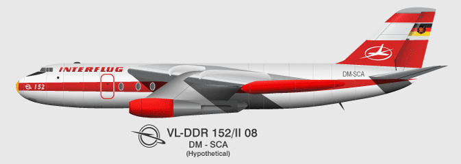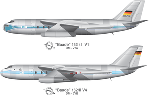 The Baade 152 also known as Dresden 152, VL-DDR 152 or simply 152 was the first German jet passenger airliner. It was built and tested in Dresden (East Germany) between 1956 and 1961. The "152" represents the final development in the Junkers aircraft family which ended with the "development planes" (Entwicklungsflugzeug - EF). Design and developmentBaade is the name of the designer of the plane, Brunolf Baade. Only two prototypes for flight were built. The first prototype V1/I (DM-ZYA) was derived from the Samoljot 150 or Alekseyev 150 jet bomber designed by former Junkers engineers in the Soviet Union. It included a tandem landing gear and glazed nose for the navigator, which was a common feature in many Eastern Bloc aircraft. The 152's landing gear was unusual for a passenger plane in that the main gear was housed along the centerline of the fuselage with outrigger wheels in the wing-tips (similar to the more well-known Boeing B-47). The tail of the airplane was tested on a propeller driven aircraft, the Soviet Il-14, which was built under license in East Germany. The maiden flight of this aircraft took place 4 December 1958 and lasted 35 minutes. The aircraft was lost on its second flight in a crash at Ottendorf-Okrilla while beginning landing approach on 4 March 1959, taking the lives of the entire crew. The reasons for the crash were never fully investigated and the results of the limited investigation were only made public in 1990. Test flights continued with the second prototype V4/II (DM-ZYB). This second prototype had a different landing gear configuration, with an unusual configuration of the main landing gear sharing the same pylon as the engines. This aircraft also had abandoned the glazed nose for the navigator. The third prototype, V5/II (DM-ZYC), only served ground tests. The flight testing for commercial use was nearly finished by early 1961 with four aircraft in production for the East German state airline Deutsche Lufthansa (later rebranded Interflug). At this time, the East German government stopped all aeronautical industry activities, as the Soviet Union who promoted their own design Tu-124 did not want to buy any of these aircraft nor supported any further development. All examples of the aircraft were scrapped though currently there is a restoration of the abandoned 152/II #011 fuselage, which was begun in 1995 at EADS EFW (Elbe Flugzeugwerke GmbH) in Dresden, which is the direct successor of VEB Flugzeugwerke Dresden. Chronology