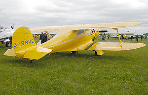 The Model 17's unusual wing configuration—the upper wing inversely staggered behind the lower—and unique shape resulted in a design that maximized the pilot's visibility while minimizing the aircraft's tendency to stall. The fabric-covered fuselage was faired with wood formers and stringers placed over a welded, steel tube frame. The construction of the plane was complex and took many manhours to complete. The Staggerwing's retractable conventional landing gear, uncommon at that time, combined with streamlining, light weight, and its use of powerful radial engines helped it perform significantly better than other biplane designs. In the mid-1930s, Beech embarked upon a major redesign of the aircraft, to be known officially as the Model D17 Staggerwing. The D17 featured a lengthened fuselage that improved the aircraft's landing characteristics by increasing the leverage generated by the elevator. Ailerons were relocated on the upper wings, eliminating any interference with the air flow over the flaps. Braking was improved by the introduction of a foot-operated brake that was synchronized with the rudder pedals. All of these modifications enhanced the Staggerwing's performance, which would soon be put to the test under wartime conditions. Operational historySales started slowly at first; the first Staggerwings' high price tag (between US$14,000 and US$17,000, depending on the size of the engine) scared off potential buyers in an already depressed market for civil aircraft. Only 18 Model 17s were sold during 1933, the first year of production, but sales steadily increased. Each Staggerwing was custom-built by hand. The luxurious cabin, trimmed in leather and mohair, could hold up to five passengers. Eventually, the Staggerwing captured a substantial share of the passenger aircraft market. By the start of World War II, more than 424 Model 17s had been sold. Air racingThe Staggerwing's speed also made it the darling of the air racers of the 1930s. An early version of Model 17 won the 1933 Texaco Trophy Race. In 1935, a British diplomat, Capt. H.L. Farquhar, successfully flew around the world in a Model B17R, traveling 21,332 miles (34,331 kilometers) from New York to London, by way of Siberia, Southeast Asia, the Middle East, North Africa and back across Europe. Louise Thaden and Blanche Noyes won the 1936 Bendix trophy in a Model C17R Staggerwing. Thaden also won the Harmon Trophy for her achievement. Jackie Cochran set a women's speed record of 203.9 mph, established an altitude record of over 30,000 feet (9,144 m), and finished third in the 1937 Bendix Trophy Race, all while flying a special Model D17W Staggerwing. The aircraft made an impressive showing in the 1938 Bendix race as well. In 1970 due to a dispute with the T-6 racing class the Reno National Air Races invited five Staggerwings to do a demonstration race. Two G models and two D17 models raced. The five pilots were Bryant Morris, Bert Jensen, Don clark, Noel Gourselle, and Phil Livingston the only pilot to have prior racing experience in the T-6 Class. The race was flawless with ABC Wide World of Sports Coverage but protesting T-6 racers prevented the class from future competition with spurious allegations of safety issues. World War IIAs World War II loomed on the horizon, a number of Model B17L were pressed into service by the forces of the Second Spanish Republic as bombers during the Spanish Civil War. China ordered a number of Staggerwings to use as ambulance planes in its fight against Imperial Japan. Finland had one B17L as a liaison aircraft between 1940-1945. On October 2, 1941, Beech shipped a special camouflaged D17S to Prince Bernhard of Lippe, who was in exile in London after the Germany invasion of The Netherlands. He used it for refugee work in and around London. The Beech UC-43 Traveler was a slightly modified version of the Staggerwing. In late 1938, three Model D17S were purchased for evaluation by the United States Army Air Corps for possible use as a light liaison aircraft. These were designated YC-43. After a short flight test program, the YC-43s were sent to Europe to serve as liaison aircraft with the air attachés in London, Paris and Rome. Early in World War II, the need for a compact executive-type transport or courier aircraft became apparent and in 1942 the United States Army Air Forces ordered the first of 270 Model 17s for service within the United States and overseas as the UC-43. These differed only in minor details from the commercial model. To meet urgent wartime needs, the government also purchased or leased (impressed) additional "Staggerwings" from private owners including 118 more for the Army Air Force plus others for the United States Navy. In Navy service the planes were designated as GB-1 and GB-2. The British Royal Air Force and Royal Navy also received 106 "Traveller Mk. I" (the British name uses the anglicized double "l" spelling) through the Lend-Lease arrangement to fill its own critical need for light personnel transports. The production UC-43 differed in minor details from the service test YC-43. Two distinguishing external features of the UC-43 are the circular ADF antenna mounted between the main landing gear and landing lights near the lower wingtips. They were all powered by the 450 horsepower (336 kilowatt) Pratt & Whitney R-985 engine. Post-warAfter the war's end, Beech immediately converted its manufacturing capabilities back to the production of civil aircraft with one final version of the Staggerwing, the Model G17S. 16 aircraft were built and sold at a price of US$29,000 apiece. One D17S was sold to Finland from Norway in 1949 and it was used for Finnish Air Force between 1950-1958. The lightweight V-tail Beechcraft Bonanza, a high-powered four-passenger luxury aircraft, soon replaced the venerable Staggerwing in the Beech product line, at about one-third the price. The Bonanza was a much smaller aircraft with much less horsepower, but carried four people with almost
