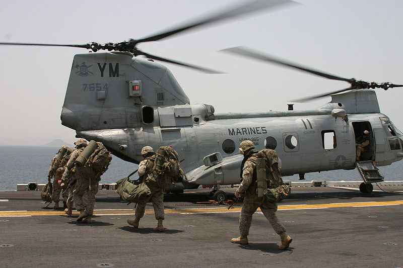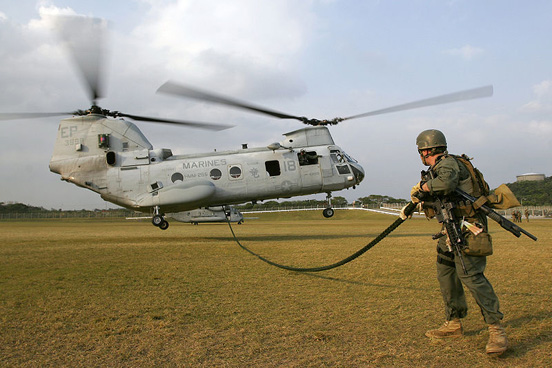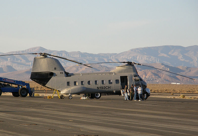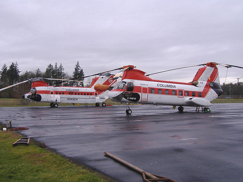 The order was later decreased to three, so the Army could divert funds to the V-114, also a turbine powered tandem, but larger than the V-107. The Army's three YHC-1As were powered by GE-T-58 engines. The YHC-1As first flew in August 1959, and were followed by an improved commercial/export model, the 107-II. During 1960, the U.S. Marine Corps (USMC) evolved a requirement for a twin-turbine troop/cargo assault helicopter to replace the piston engine types then in use. Following a design competition, Boeing Vertol was selected to build its model 107M as the HRB-1, early in 1961. Boeing had acquired Vertol in 1960 and renamed the group Boeing Vertol. The helicopter was first procured in 1961 to meet the medium-lift requirements of the Marine Corps. Its first flight in August 1962 was followed by a change in designation to CH-46A. Fleet introduction of CH-46As with the Marines and the Navy's UH-46As in November 1964. The UH-46A variant was modified for use in the vertical replenishment role. The CH-46A was equipped with a pair of T58-GE8-8B turboshaft engines rated at 1,250 shp (930 kW) each and could carry 17 passengers or 4,000 pounds (1,815 kg) of cargo. The USMC received 160 CH-46As and the US Navy acquired 14 UH-46As. Production of the improved CH-46D followed with deliveries beginning in 1966. Its improvements included modified rotor blades and more powerful T58-GE-10 turboshaft engines rated at 1,400 shp (1,040 kW) each. The increased power allowed the D-model to carry 25 troop or 7,000 pounds (3,180 kg) of cargo. A total of 265 CH-46Ds were produced. The Navy received 10 UH-46Ds for ship resupply. Also, approximately 12 CH-46As were upgraded to CH-46Ds. The Marines also received 174 CH-46Fs from 1968 to 1971. The F-model retained the D-model's T58-GE-10 engines but revised the avionics and included other modifications. The CH-46F was the final production model with the last helicopter being the 524th H-46 produced. The Sea Knight has undergone upgrades and modifications. Most USMC Sea Knights were upgraded to CH-46E standard. The CH-46E features fiberglass rotor blades, airframe reinforcement, and further uprated T58-GE-16 engines producing 1,870 shp (1,390 kW) each. Some CH-46Es have been given doubled fuel capacity. The Dynamic Component Upgrade (DCU) incorporated starting in the mid-1990s provides for increased capabilities through strengthened drive systems and rotor controls. The commercial variant, the BV 107-II, was first ordered by New York Airways in 1960. They took delivery of their first three aircraft, configured for 25 passengers, in July 1962. In 1965, Boeing Vertol sold the manufacturing rights of the 107 to Kawasaki Heavy Industries. Under this arrangement, all Model 107 civilian and military aircraft built in Japan are known as KV 107. On December 15, 2006, Columbia Helicopters, Inc acquired the type certificate for the Boeing Vertol 107-II, and is in the process of acquiring a Production Certificate from the FAA. Plans for actual production of the aircraft have not been announced. DesignThe CH-46 has tandem contrarotating rotors that were powered by two GE T58 turboshaft engines. The engines are mounted on each side of the rear rotor pedestal with a driveshaft to the forward rotor. The engines are coupled so either could power both rotors in an emergency. The rotors feature three blades and could be folded for on-ship operations. The CH-46 has a cargo bay with a rear loading ramp that could be removed or left open in flight for extended cargo or for parachute drops. A belly sling hook could be attached for carrying external cargo. It has a crew of three. A pintle-mounted 0.50 in (12.7 mm) Browning machine gun was mounted on each side of the helicopter for self-defense. Service in southeast Asia resulted in the addition of armor with the guns. The CH-46 has fixed tricycle landing gear, with twin wheels on all three units. The gear configuration causes a nose-up stance to facilitate cargo loading and unloading. The main gear are fitted in rear sponsons that also contained fuel tanks with a total capacity of 350 US gallons (1,438 L). Operational historyMilitary