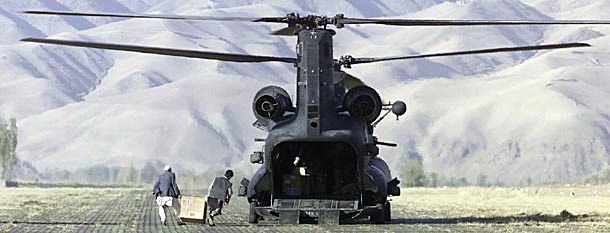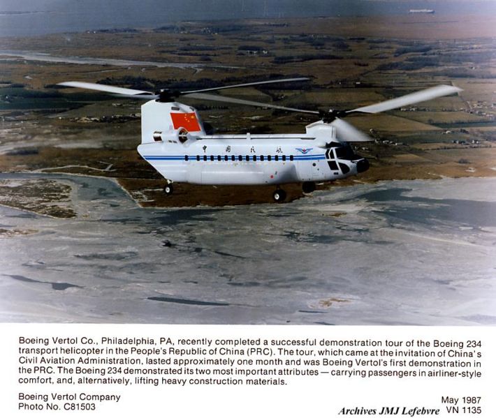 The Boeing CH-47 Chinook is a versatile, twin-engine, tandem rotor heavy-lift helicopter. Its top speed of 170 knots (196 mph, 315 km/h) was faster than utility and attack helicopters of the 1960s and even many of today. Its primary roles include troop movement, artillery emplacement and battlefield resupply. It has a wide loading ramp at the rear of the fuselage and three external-cargo hooks. Chinooks have been sold to 16 nations; the largest users are the U.S. Army and the Royal Air Force, see Boeing Chinook (UK variants). The Chinook is now produced by Boeing Integrated Defense Systems. Design and developmentLate in 1956 the Department of the Army announced plans to replace the CH-37 Mojave, which was powered by piston engines, with a new, turbine-powered aircraft. A design competition was held and, in September 1958, a joint Army-Air Force source selection board recommended that the Army procure the Vertol medium transport helicopter. However, the necessary funds to proceed with full-scale development were not available and the Army vacillated in its design requirements. Some in the Army felt that the new helicopter should be a light tactical transport aimed at the mission of the old H-21s and H-34s and, consequently, sized for approximately fifteen troops. Another faction believed that the new transport should be much larger to serve as an artillery prime mover and have minimum interior dimensions compatible with the Pershing Missile System. This "sizing" problem was a critical decision. Vertol began work on a new tandem rotor helicopter designated Vertol Model 107 or V-107 in 1957. In June 1958, the US Army awarded a contract to Vertol for the aircraft under the YHC-1A designation. The YHC-1A was tested by the Army to derive engineering and operational data. Three aircraft were built with a maximum troop capacity of twenty. However, the YHC-1A was considered by most of the Army users to be too heavy for the assault role and too light for the transport role. The decision was made to procure a heavier transport helicopter and at the same time upgrade the Huey as a tactical troop transport. This decision was to determine the pattern of airmobile operations for the next decade. As a consequence, the Army concept of air assault operations differed from the Marines because, among many reasons, the very nature of the equipment demanded different methods of employment. The YHC-1A would be improved and redesignated CH-46 Sea Knight in 1962. The Army then ordered the larger Model 114/HC-1B. The pre-production Boeing Vertol YCH-1B made its initial hovering flight on September 21, 1961. In 1962 the HC-1B was redesignated the CH-47A under the 1962 United States Tri-Service aircraft designation system. The name "Chinook" alludes to the Chinook people of the Pacific Northwest. The Chinook is powered by two turboshaft engines, mounted on either side of the helicopter's rear end and connected to the rotors by driveshafts. The counter-rotating rotors eliminate the need for an anti-torque vertical rotor, allowing all power to be used for lift and thrust. If one engine fails, the other can drive both rotors. The "sizing" of the Chinook was directly related to the growth of the Huey and the Army's tacticians' insistence that initial air assaults be built around the squad. There was a critical stage in the Huey program when the technicians insisted not to go beyond the UH-1B model with Bell; that there should be a new tactical transport "between" the Huey and medium transport helicopter. By resolutely pushing for the Huey and the Chinook, the Army accelerated its airmobility program by years. A commercial model of the Chinook, the Boeing-Vertol Model 234, is used worldwide for logging, construction, fighting forest fires and supporting petroleum exploration operations. As of December 15, 2006 Columbia Helicopters, Inc. of Aurora, Oregon has purchased the Type Certificate of the Model 234 from Boeing. Currently the company is seeking FAA issuance of a Production Certificate to produce parts with eventual issuance of a Production Certificate to produce aircraft. The Chinook was also built under license by Elicotteri Meridionali (Agusta) in Italy and Kawasaki in Japan. Operational historyVietnam WarThe Army finally settled on the larger Chinook as its standard medium transport helicopter and as of February 1966, 161 aircraft had been delivered to the Army. The 1st Cavalry Division had brought their organic Chinook battalion with them when they arrived in 1965 and a separate aviation medium helicopter company, the 147th, had arrived in Vietnam on 29 November 1965. This latter company was initially placed in direct support of the 1st Infantry Division. Over 120 CH-47's would be lost to all causes during the war. The most spectacular mission in Vietnam for the Chinook was the placing of artillery batteries in perilous mountain positions inaccessible by any other means, and then keeping them resupplied with large quantities of ammunition. The 1st Cavalry Division found that its Chinooks were limited to 7,000 pounds payload when operating in the mountains, but could carry an additional 1,000 pounds when operating near the coast. The early Chinook design was limited by its rotor system which did not permit full use of the installed power, and users were anxious for an improved version which would upgrade this system. As with any new piece of equipment, the Chinook presented a major problem of "customer education". Commanders, pilots and crew chiefs had to be constantly alert that eager soldiers did not overload the temptingly large cargo compartment. It would be some time before the using troops would be experts at sling loads and educated in such minor details as removing the gunner's sight from the artillery pieces. The Chinook soon proved to be such an invaluable aircraft for artillery movement and heavy logistics that it was seldom used as an assault troop carrier. The early decision to move to a helicopter