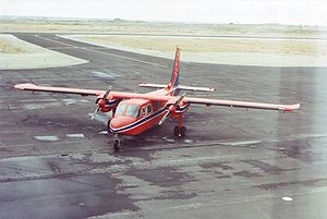 The Britten-Norman BN-2 Islander is a 1960s British light utility aircraft, mainline airliner and cargo aircraft designed and originally manufactured by Britten-Norman of the United Kingdom. The Islander is one of the best-selling commercial aircraft types produced in Europe. Although designed in the 1960s, over 750 are still in service with commercial operators around the world. The aircraft is also used by the Army and Police forces in the United Kingdom and is a popular light transport with over 30 military aviation operators around the world. Design and developmentBritten-Norman was started in 1953 to convert and operate agricultural aircraft and it also produced hovercraft (Cushioncraft, later sold to the British Hovercraft Corporation). Design of the Islander started in 1963 and the first prototype BN-2 first flew on 13 June 1965, with the second prototype on 20 August 1966. Both of these aircraft had engines that were less powerful than the production versions. The Islander is a high-wing cantilever monoplane with a rectangular fuselage and two-wing mounted engines. A conventional tail unit and a fixed tricycle landing gear, the fuselage will usually accommodate one pilot and up to nine passengers. The first production Islander first flew on 24 April 1967 and was certified in August 1967. Production started at the Britten Norman factory at Bembridge, Isle of Wight but within a few years the company could not keep up with demand, a contract was placed with IRMA of Romania initial to produce aircraft from a kit of parts but the Romanian factory soon became the main source for production Islanders.A military version of the Islander was marketed as the Defender with underwing hard points and fitted out as a light troop transport and support aircraft and first flown in 1970. The second prototype was developed into a stretched Super Islander but the program was stopped and the aircraft was used as a basis of the three-engined version, the Trislander. The company was in financial difficulties and by the end of 1970 went into receivership. In 1972 the company was bought by the Fairey Aviation Group and production of the Islander and Trislander was moved to their factory (Avions Fairey) in Gosselies in Belgium although the aircraft were flown to Bembridge for final customer preparation. The new company developed the Turbo Islander with Lycoming LTP101 turboprops but the engines were too powerful for the aircraft and the design evolved into the Turbine Islander (BN-2T) with Allison 250 turboprops. Fairey then suffered financial problems and called in the receiver and the Fairey Britten Norman company was sold to Pilatus of Switzerland. An improved version, the BN-2A Islander, first flew in 1969. It incorporated aerodynamic and flight equipment improvements as well as changes to the baggage arrangements. In 1978 a further improved version, the BN-2B Islander II was introduced. Improvements included increased carrying capacity and propeller modifications to reduce noise levels. Options included a long-nosed version for increased baggage capacity, raked wingtip auxiliary fuel tanks and twin Allison 250-B17C turboprop engines. When the latter are installed the aircraft is designated the BN-2T Turbine Islander. A military conversion of the Islander, the Defender 4000, is capitalizing on the Islander's rugged structure for use in Third World countries. Recent purchases from police and military customers centres around use in surveillance and counter-terrorism operations. The Maritime Defender is another military version of the Islander, intended for search and rescue, coastal patrol and fishery protection. Licensed productionA number of companies in addition to Britten-Norman have manufactured the Islander. IRMA from Romania has been building the aircraft since 1969, including the SONACA (Fairey), in Gosselies, Belgium. 35 have also been assembled in the Philippines. TrislanderA design project to develop an Islander with a larger capacity resulted in the BN-2A Mk III Trislander. This aircraft has a stretched fuselage, modified landing gear and a third (tail-mounted) engine. The prototype was constructed from the original second BN-2 prototype and flew on 11 September 1970. Variants