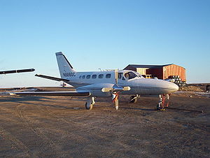 The Cessna 441 Conquest II was the first turboprop designed by Cessna and was meant to fill the gap between their jets and piston-engined aircraft. It was developed in November 1974, with the first aircraft delivered in September 1977. It is a pressurized, turbine development of the Cessna 404. Design and developmentThe aircraft has retractable tricycle landing gear and on takeoff has a ground roll of 1,785 ft (544 m). The Conquest is powered by two Garrett TPE331 turboprops powering two four-bladed McCauley propellers. A 441 with Pratt & Whitney Canada PT6A-112 turboprops was flown in 1986 but did not enter production. ModificationsThe majority of Cessna 441s have been modified by installing Garrett TPE331-10 engines in place of the earlier versions of this same engine that it was delivered with. This modification reduces maintenance costs while increasing horsepower, service ceiling, fuel efficiency and range. Cessna 441s with this conversion tend to have higher resale values than aircraft that have not been converted. Converting from the standard three blade propellers to smaller diameter Hartzell four blade propellers results in a climb rate improved by 200 fpm (1.01 m/s) and a 5 kn (9 km/h) increase in cruise speed as well as reducing cabin noise and improving ground clearance. Airframe LimitationsThe Cessna 441 is limited to 22,500 hours of air time by a Cessna Supplementary Inspection Document (SID). This life-limit SID is mandatory in the USA for air carriers operating the aircraft but is advisory only for private operators. DesignationThe ICAO designator for the Cessna Conquest as used in flight plans is C441. Further developmentsA smaller aircraft was marketed as the Cessna 425 Conquest I, itself a turbine development of the Cessna 421. Specifications (Conquest II)Reference:Flight Research General characteristics