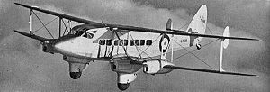 The de Havilland Express was a four-engined passenger aircraft from the 1930s manufactured by the de Havilland Aircraft Company. DevelopmentDuring 1933, talks between the governments of United Kingdom, India, Malaya, the Straits Settlements and Australia resulted in an agreement to establish an Empire Air Mail Service. The Australian Government called for tenders on 22 September 1933 for the Singapore-Australia legs of the route, continuing as far south as Tasmania. On the following day Qantas, anticipating success in contracting for the Singapore-Brisbane leg, placed an order with de Havilland for an as-yet non-existent aircraft to be designated the de Havilland 86, the prototype to fly by the end of January 1934. This order was soon followed by one from Holymans Airways of Launceston, Tasmania to operate the Bass Strait leg of the service. The D.H.86 was initially styled the Express or Express Air Liner although the name was soon discontinued. The D.H.86 was conceptually a four-engined enlargement of the successful de Havilland Dragon, but of more streamlined appearance with tapered wings and extensive use of metal farings around struts and undercarriage. The most powerful engine made by de Havilland, the new 200 hp (149 kW) Gipsy Six, was selected. For long-range work the aircraft was to carry a single pilot in the streamlined nose, with a wireless operator behind. Maximum seating for ten passengers was provided in the long-range type, however the short-range Holyman aircraft were fitted with twelve seats. The prototype D.H.86 first flew on 14 January 1934, but the Qantas representative Lester Brain immediately rejected the single pilot layout because he anticipated pilot fatigue over long stretches, and the fuselage was promptly redesigned with a dual-pilot nose. Only four examples of the single-pilot D.H.86 were built, and of these the prototype was rebuilt as the dual-pilot prototype. When she entered service in October 1934 the first production aircraft, Holymans' single-pilot D.H.86 Miss Hobart, was the fastest British-built passenger aircraft operating anywhere in the world. Despite de Havilland's predictions to the contrary, the dual pilot type with its lengthened nose proved to be even faster. Investigations in 1936 following a series of fatal crashes resulted in late production aircraft being built with additional fin area in the shape of vertical "Zulu Shield" extensions to the tail planes to improve lateral stability - these aircraft were designated D.H.86Bs. Operational History