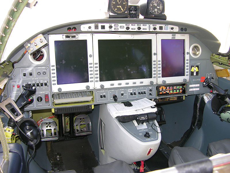 Founder and former Eclipse CEO Vern Raburn was one of the first business executives at Microsoft. Subsequently, Bill Gates became a major stake-holder in the Eclipse project. The VLJ concept has been pursued by a number of manufacturers, and because the V-Jet II had been designed around one of the primary VLJ engines, Eclipse believed it was an ideal design to refine and market. The airframe was significantly redesigned as an all-metal structure with a T-tail and straight wings. The main cabin shape is essentially all that was retained from the V-Jet II. It was recognized that for an aluminum structure to be cost effective, new manufacturing techniques would have to be developed. One of the primary processes used was friction stir welding, in which the skin and underlying aluminum structure are welded together rather than riveted, as traditional for aluminum aircraft. Anti-corrosion bonding techniques were also developed. Besides materials processes, the general process of building the airframe was redesigned, with techniques taken from the automotive industry. Traditionally, aircraft structure is mounted in a jig, and the skin is riveted on to the outside of it. For the Eclipse 500, lessons were taken from composite airframe manufacturing, and the aluminum skin is first laid in a mold, and then the structure is built into it. The result is much more precise control of the aircraft's final shape, resulting in a cabin that is more robust and can be pressurized to a higher differential. In addition, the manufacturing techniques are designed so that one crew can assemble an airframe in a single shift. The complete interior is designed to be installed on a moving assembly line in 45 minutes. Originally Eclipse selected a pair of Williams International EJ-2 engines (a production variant of the FJ22/FJX-2) for the Eclipse 500, but as the aircraft's weight increased, performance was not satisfactory. Pratt & Whitney Canada agreed to participate in the project, and modified the design of their PW615 engine, designating it the Pratt & Whitney Canada PW610F. The prototype Eclipse 500 first flew with the Williams engines in 2002.The redesign to incorporate the new engines resulted in a significant delay to the development program. The first flight of the Eclipse 500 with the new engines occurred on December 31, 2004. An Eclipse press release says that its aircraft is "the quietest jet aircraft" and that it is "quieter than virtually all multi engine turboprop and piston aircraft". Instrument PanelThe Eclipse 500 cockpit has glass cockpit technology and an integrated avionics package. Problems with the original configuration have involved a re-design of the system. The first aircraft have the original system called Avio installed. Later aircraft have the Avio NG system in place of the original Avio. The new avionics package was certified in December 2007 and it was intended at that time that the older Avio-equipped aircraft would be retrofitted to the same standard by the end of 2008. CertificationUSAThe Eclipse 500 received provisional type certification from the FAA on 27 July 2006, shortly after the aircraft's PW610F engine was certified by the Canadian authorities. FAA Administrator Marion Blakey presented Raburn with the provisional certificate in a special ceremony at the 2006 Oshkosh Airshow. Full certification was not granted at that time because the composite wing tip fuel tanks did not meet FAA lightning strike criteria. As a result, Eclipse started testing an improved wingtip fuel tank made from aluminium. Eclipse also started ramping up production of the 500, so aircraft could be released to customers once full certification was achieved. Full type certification was eventually achieved on 30 September 2006. At that point, in addition to the five flying prototypes, 23 aircraft were in production and two had already been completed. The 500 type certificate allows the aircraft to be flown under IFR with a single pilot. Eclipse received its FAA production certificate on 26 April 2007. Serial numbers 1-11 were produced prior to the production certificate being granted. These aircraft were subject to individual FAA inspection. 500 serial number 12 and subsequent were built under production certificate No. 500. The aircraft received its certification for flight into "known icing conditions" on 25 June 2008, although this is yet to be added to the current type certificate data sheet, which is Revision 2, 15 January 2008.