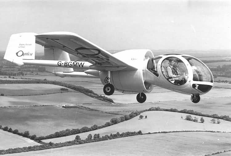 The Edgley EA-7 Optica was a British light aircraft designed for observation work, intended as a low-cost alternative to helicopters, retailing originally at around US$200,000. OverviewThe Optica, designed by John Edgley and built by Brooklands Aerospace, had an unusual configuration with a fully-glazed forward cabin seating three across, reminiscent of an Alouette helicopter. Behind it was situated a Lycoming flat-six engine powering a ducted fan, twin boom cantilever tailplane with twin rudders and a high-mounted single elevator. The fixed tricycle undercarriage had the nosewheel offset to the left. The wings were unswept and untapered, and the aircraft was of a fairly standard all-metal construction with stressed aluminium skin. The aircraft's distinctive appearance led to it being known as the "bug-eye" in some popular reports. It first flew on 14 December 1979 , powered by a 150 hp (112 kW) Lycoming O-320 engine. The Optica, now powered by a more powerful Lycoming O-540, entered production in 1983, achieving certification on 8 February 1985. A crash of police Optica G-KATY on 15 May 1985 killed two members of the Hampshire ConstabularyThe cause was suspected to be a stall: insufficient airspeed during a turn causing instability. The reason for the low speed was never established. This led to the bankruptcy of Edgley, with Optica Industries being formed in October 1985 to continue production and 25 were built before a fire caused by arson destroyed the factory and all but one flying Optica. The company was reformed again as Brooklands Aircraft, and the Optica returned to production, production ceasing in March 1990, when Brooklands Aircraft went bankrupt. An example featured in the 1989 movie Slipstream. There was a grounding order by the FAA due to cracks developed in the wing spars but this is not in force as there are two examples flying in the U.S. and two are flying in Australia. There are a further two in storage in the UK. The Design of the Optica has now been bought by John Edgley once more (along with the design for the FLS Sprint 160). Edgley hopes to put both types into production and further to that goal the Optica 300 Series s/n 021 G-BOPO is being restored as a UK type demonstrator. Specifications (Optica Scout)Data from Jane's All the World's Aircraft, 1988-1989 General characteristics