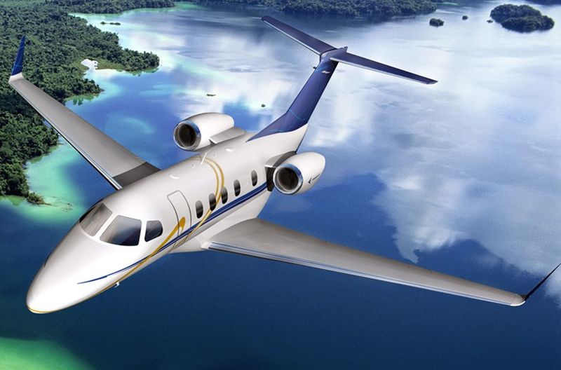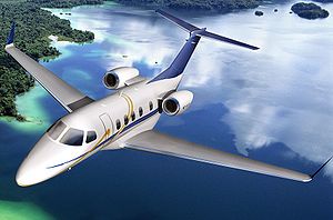 The Embraer Phenom 300 is a light jet aircraft developed by the Brazilian aircraft manufacturer Embraer. It can carry 8 or 9 occupants with a flying range of 1,800 nautical miles. Its price is estimated at US$ 6.85 million in January 2005 economic conditions, with a production date of 2009. The plane has a flexible configuration for up to nine occupants, with a private rear lavatory, refreshment center and baggage area. At 45,000 feet, the Phenom 300 is pressurized to a cabin altitude of 6,000 feet. The jet features single-point refueling and an externally serviced lavatory. Operators