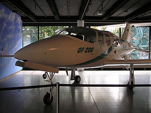 The Grob GF 200 was a business aircraft of unorthodox design developed in Germany during the 1990s. It was a low-wing cantilever monoplane with retractable tricycle undercarriage and a highly streamlined fuselage. The engine was mounted within the fuselage, to the rear of the passenger cabin, and drove the pusher propeller via a driveshaft. The GF 200 has a T-tail, but also a large ventral fin beneath the fuselage. Like other Grob designs, construction throughout was of composite materials, in the case of this particular aircraft, including the driveshaft. Development commenced in 1983 but was postponed due to concerns about achieving certification for the composite design. However, with financial support from the German government, development commenced in earnest by the end of the decade. The project officially launched at the Hannover Show in May 1988, at which a mockup of the design was displayed and a hope expressed to have the aircraft flying within two years. As it transpired, the prototype was rolled out in March 1991, in the hope of a first flight by May, and which finally took place on 26 November. The aircraft made its first public appearance at the Berlin Air Show in 1992. Initial flight tests revealed problems with engine cooling and excessive noise. The former concern was addressed by a redesign of the engine air intakes. The prototype was intended as a test aircraft and technology demonstrator, and lacked many of the refinements that would have been incorporated into a production aircraft, including cabin presurisation, de-icing equipment, and even a complete cabin interior. When Grob was unable to find financial backing to take the design further, the company embarked on the construction of a more "true-to-life" prototype in 1997, the GF 250, in the belief that this would prove more attractive to potential business partners. Further planned developments included the turboshaft-powered GF 300, and the GF 350 with twin turboshaft engines driving a common propeller. Specifications (GF 200)General characteristics
