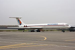 The Il-62M variant (first flight in 1971, introduced in 1973) has more powerful and quieter Soloviev D-30KU engines and a fin fuel tank. Beneath the skin, the Il-62M has simpler and lighter single-slotted flaps and incremental aerodynamic improvements. Most important of these was the addition of spoilerons (spoilers or wing-mounted airbrakes which act as ailerons by differential deployment in cruising flight) and the ability to use idle reverse thrust in flight during the final approach so as to shorten the landing run. Nearly all examples in service today are Il-62Ms. In 1978, the Il-62M was further developed to seat up to 198 passengers and carry some two tonnes (4,400 lb) more payload and/or fuel than the Il-62M. A version designated Il-62MK was designed as a much modified medium range machine, though it never reached production and was dropped from the programme by 1978. Other versions were also planned, some "stretched" to seat up to 250 passengers and others suited to small airfields. None of those reached the detail design stage. No civil/military or military developments are known. The key to understanding the Il-62's design is its "four wheeled" landing gear. The trademark lightweight landing gear at the rear of the plane is there because the aeroplane's main landing gear is deliberately sited ahead of the aircraft's centre of gravity, rather than behind it as in conventional designs. This was done in order to lengthen the tail moment arm (the lever arm over which the tailplane [horizontal stabilizer] acts to control the aircraft in pitch). The longer tail moment arm reduces the size and weight of the tailplane (it is two thirds the size of that of the similar Super VC10), improving controlability and cutting drag. It makes the Il-62 suitable for manual control, since the physical effort needed to fly it is within the capabilities of the average pilot. The Il-62 is the largest airliner with manual flight controls, using steel cables and rods, pulleys, aerodynamic and weight balances, and trim tabs. There are also indications that the Il-62 has a forward-mounted tank for water ballast. This may be used when the aircraft flies empty or lightly loaded. If this is a fact, it would rank the Il-62 alongside other airliners that use ballast, notably the French Caravelle and the Soviet Tu-154. Another key Il-62 trademark is the "saw tooth" ("dog tooth") on the wing leading edge. This prominent feature acts as an aerodynamic fence, vortex generator, and fixed leading edge droop/slat/flap. It ensures vice-free behaviour at high angles of attack and assists efficient long-range cruise. The saw tooth removes the need for hydraulic controls, stick shakers, and stick pushers. Interestingly, later models of the VC10 (for British United Airways and Ghana Airways) also adopted this feature, in their case closer to the wing tips. Later examples of the Il-62 are still in regular commercial service, mostly with countries of the former Soviet Union and Eastern Bloc, but also with China (most Soviet airliners have been retired in China), Libya and North Korea. The type also sees service as a VIP/head of state transport. Early Il-62's fitted with the N-K 8-4 powerplants suffered from indifferent performance as well as overheating on long-haul flights, a problem that may have contributed to two fatal crashes caused by contagious engine failure (where failure in one engine causes its neighbour also to fail, in the process often causing further damage to adjacent areas, a similar problem to that which occurred in some early VC10 incidents). Curiously, both crashes occurred with the same airline, the highest fatality of which was LOT Polish Airlines Flight 5055 on May 9, 1987, in which all 183 on board perished. Earlier, LOT had lost another Il-62, Flight 007, on March 14, 1980, with 87 dead. After the second crash, LOT modified its maintenance procedures with more frequent engine overhauls. By this stage, Ilyushin had begun to upgrade Aeroflot's fleet of IL-62s with the D-30 KU Soloviev powerplant, which rectified the problems inherent in the N-K engines. The Il-62M went on to have a very good safety record and was well regarded by pilots. Since its first flight, there has been a total of 10 crashes resulting in fatalities (and 12 serious accidents), most of which appear to have involved the early N-K 8-4 powerplants. The type set several international records in its class, mostly exemplifying a range capability far in excess of the conservative Aeroflot calculations applied in Soviet times. Some of these records were set by an all-woman crew of five captained by Iraida ("Inna") Vertiprahova. A sideline to the Il-62 story concerns industrial espionage. The Il-62 series was developed at about the same time as the British VC10, to which it bears a marked resemblance. Some British sources claim the Soviets stole the VC10 design, occasionally dubbing the Il-62 the "VC10-ski." However, there are significant differences between the two machines, as the Soviet type is larger, lifts a greater load, covers a longer range, and is suited only to developed airports vis-a-vis the British type's adaptability to "up-country" bases. It is an entirely civil machine, whereas the VC10 was designed to double as an airlifter as well as a military freighter. The Il-62 also uses conservative technology, such as mechanical control surface linkages, unlike the VC10. On 23 October 1989, the Ilyushin Il-62 "DDR-SEG" of the East German airline Interflug was intentionally landed on the 900 m short grass airfield of Stölln/Rhinow in a risky and dusty maneuver. The jet is used to commemorate the site of the fatal crash of Otto Lilienthal (1848–1896) at the Gollenberg hill. Nick-named "Lady Agnes" after Lilienthal's wife, it is now used as a museum and for weddings. Description and equipmentThe Il-62 is a conventional all-metal low-wing monoplane of riveted sectional semi-monocoque construction to fail-safe design principles (a stru