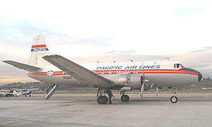 The Martin 4-0-4 is an American pressurized passenger airliner built by the Glenn L. Martin Company. As well as airline use initially in the United States, it was used by the United States Coast Guard and United States Navy as the RM-1G (later as the VC-3A). Design and developmentWhen production of the earlier Martin 2-0-2 was stopped due to problems with wing structural failure the company decided to re-wing an improved version (which had already flown as the Martin 3-0-3). The new aircraft was the Martin 4-0-4, it had structural changes to the wings, pressurization and lengthened slightly to take 40 passengers. Like the earlier 2-0-2, the 4-0-4 was a cantilever monoplane with a standard tail unit (cantilever tailplane and single vertical stabilizer). It had rear ventral stairs and a retractable tricycle landing gear and was powered by two Pratt & Whitney R-2800-CB16 radial piston engines. Operational historyFirst deliveries in 1951 were made to Eastern Air Lines (EAL) who had ordered 60 and Trans World Airlines (TWA) who had ordered 40. The only other new aircraft from the production line were delivered to the United States Coast Guard who had ordered two as executive transports with the designation RM-1G later changed to RM-1 and then in 1962 to VC-3A. In 1969 they were transferred to the United States Navy and they had both been withdrawn from use by 1970. A total of 103 aircraft was built at the Glenn L. Martin factory in Baltimore. TWA operated their 40 4-0-4s under the name "Skyliner" on scheduled services in the eastern part of the USA between 1 September 1950 and the last flight on 29 April 1961.. EAL operated their 4-0-4s in the eastern USA using the class name "Silver Falcon". The first EAL schedule was flown on 5 January 1952 and retirement came in late 1962. Later in their airline career, as they became displaced from the EAL and TWA fleets by turbine-powered aircraft, the 4-0-4s became popular with "second level" operators who needed to replace their Douglas DC-3s. One of the last 'major' US airlines with a large fleet of piston engined airliners was Southern Airways who operated 25 model 4-0-4s on a network of scheduled services from Atlanta as at July 1969, mainly ex-Eastern Airlines aircraft.. Southern Airways' last 4-0-4 service was flown on 30 April 1978. The last airworthy 4-0-4, an ex TWA aircraft, was ferried to the Planes of Fame Museum in February 2008, where it is on display together with a Martin 2-0-2. OperatorsCivil