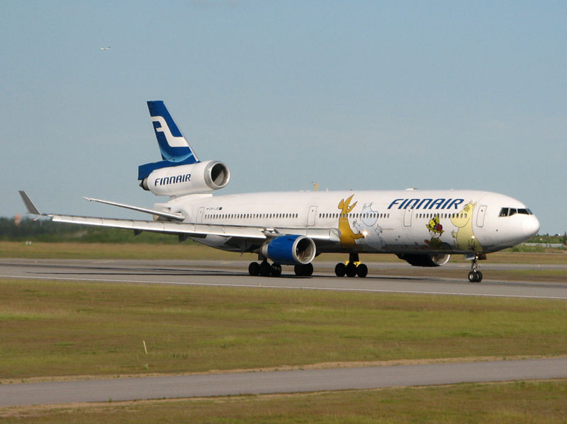 In 1981, a Continental Airlines DC-10-10 was leased to conduct more research and particularly the effects the then newly-designed winglets could have on aircraft performance. Different types of winglets were tested during that time in conjunction with NASA. McDonnell Douglas was again planning new DC-10 versions that could incorporate winglets and more efficient engines developed at the time by Pratt & Whitney (PW2037) and Rolls-Royce (RB.211-535F4). The manufacturer finally rationalized all these studies under the MD-EEE designation, that was later modified to MD-100 following some more changes. The MD-100 was proposed in two versions: the Series 10, having an airframe shorter by 6 ft 6 in (1.98 m) compared to the DC-10 and seating up to 270 passengers in a mixed class configuration; and the Series 20, incorporating a fuselage stretch of 20 ft 6 in (6.24 m) over the DC-10 and able to seat up to 333 passengers in the same kind of configuration as the Series 10. Both versions could be powered by the same engine families as the actual MD-11 plus the RB.211-600. But the situation for the manufacturer, and the airline industry in general, did not look bright. No new DC-10 orders were received, and many among the observers and customers doubted that the manufacturer would be around for much longer. Thus, the Board of Directors decided in November 1983 to cease once more all work on the projected new trijet. Good times were back the following year and airlines were placing repeat orders for the MD-80 series jets that had helped the manufacturer to travel through the past difficult years. No new orders for the DC-10 had been received, (which inspired McDonnell Douglas even more to create a replacement) but the production line was nonetheless kept active thanks to a previous order for 60 KC-10A tankers from the USAF. McDonnell Douglas was still convinced that a new derivative for the DC-10 was needed, as shown by the second-hand market of its Series 30 as well as for the heavier DC-10-30ER version. Thus, in 1984 and for the first time, a new derivative aircraft for the DC-10 was designated MD-11. From the very beginning, the MD-11X was conceived in two different versions. The MD-11X-10, based on a DC-10-30 airframe, offered a range of 6,500 nmi (12,038 km) with passengers. That first version would have had a Maximum Take-Off Weight (MTOW) of 580,000 pounds (263,157 kg) and would have used CF6-C2 or PW4000 engines. The MD-11X-20 was to have a longer fuselage, accommodating up to 331 passengers in a mixed class layout, and a range of 6,000 nmi (11,100 km). As more orders for the DC-10 were received, McDonnell Douglas used the time gained before the end of DC-10 production to consult with potential customers and to refine the proposed new trijet. In July 1985, the Board of Directors finally authorized the Long Beach plant to offer the MD-11 to potential customers. At the time, the aircraft was still proposed in two versions, both with the same fuselage length, a stretch of 22 ft 3 in (6.93 m) over the DC-10 airframe, as well as the same engine choice as the MD-11X. One version would have a range of 4,780 nmi (8,840 km) with a gross weight of 500,000 lb (227,000 kg) and transport up to 337 passengers, while the second would carry 331 passengers over 6,900 nmi (12,800 km). A year later, as several airlines had committed for the MD-11, the situation was looking optimistic. The aircraft was now a 320 seater baseline and defined as an 18 ft 7 in (5.66 m) stretch over the DC-10-30 powered by the new advanced turbofans offered by the major engine manufacturers and giving it a range of 6,800 nmi (12,600 km). Other versions, such as a shortened ER with a range of 7,500 nm (13,900 km), an all cargo offering a maximum payload of 200,970 lb (91,080 kg) and a Combi with a provision for ten freight pallets on the maindeck, were proposed. Further growth of the aircraft was also foreseen, such as the MD-11 Advanced. Design phaseFinally, the MD-11 was launched on December 30, 1986 with commitments for 52 firm orders and 40 options in three different versions (passenger, combi and freighter) from ten airlines (Alitalia; British Caledonian; Dragonair; FedEx Express; Finnair; Korean Air; Scandinavian Airlines System; Swissair; Thai Airways International and Varig) and two leasing companies (Guinness Peat Aviation and Mitsui). Orders from Dragonair, Scandinavian and UTA, an undisclosed customer, were canceled by 1988. Assembly of the first MD-11 began on March 9, 1988, and the mating of the fuselage with wings occurred in October that year. First flight was originally planned to occur in March 1989, but numerous problems with the manufacturing, delays with suppliers producing essential components and labor industrial actions led the ceremonial roll out of the prototype to happen only in September that same year. The following months were used to prepare the prototype for its maiden flight, that finally happened on January 10, 1990. The first two aircraft manufactured were intended for FedEx and thus, were already fitted with the forward side cargo door. They remained with the manufacturer as test aircraft until 1991 before being completely converted to freighter and delivered to their customer. FAA certification was achieved by November 8, 1990 while the European Joint Aviation Authorities (JAA) certified the MD-11 on October 17, 1991 after approximately 200 separate issues were resolved. The first MD-11 was delivered to Finnair on December 7, 1990 and accomplished the first revenue service by an MD-11 on December 20, 1990, when the aircraft carried passengers from Helsinki to Tenerife in the Canary Islands. First MD-11 service in the U.S. was inaugurated by Delta Air Lines, also in 1990. It was during this period that flaws in the MD-11's performance began to become apparent. It failed to meet its targets for range and fuel burn. American Airlines in particular was unimpressed, as was Singapore Airlines, which cancele