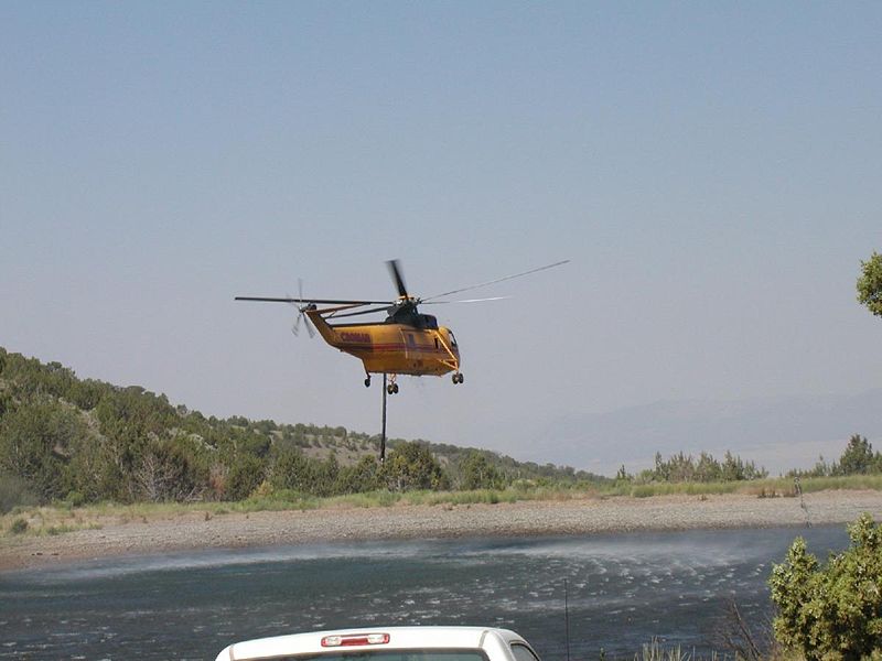 An S-61 helitanker uses a snorkel to refill its internal water tanks |