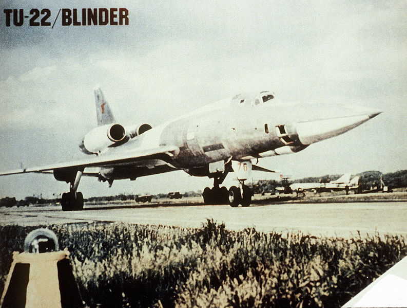 The Tupolev Tu-22 (NATO reporting name Blinder) was a Soviet supersonic bomber and reconnaissance aircraft. DevelopmentThe Tu-22 was originally intended as a supersonic replacement for the Tupolev Tu-16 bomber. The design, designated Samolët 105 by Tupolev, was drawn in 1954, and the first flight of the prototype took place on 21 June 1958. The availability of more powerful engines, and the TsAGI discovery of the Area rule for minimizing transonic drag, led to the construction of a revised prototype, the 105A. This first flew on 7 September 1959. The first serial-production Tu-22B bomber, built at Kazan Factory No. 22, flew on 22 September 1960, and the type was presented in the Tushino Aviation Day parade on 9 July 1961. It initially received the NATO reporting name 'Bullshot,' which was deemed inappropriate, then 'Beauty,' which was felt to be too complimentary, and finally 'Blinder.' Soviet crews called it "Shilo" (awl) because of its shape. The Tu-22 entered service in 1962 and 1963, but it experienced considerable problems, leading to widespread unserviceability and a number of crashes. Amongst its many faults was a tendency for skin heating at supersonic speed, distorting the control rods and causing poor handling. The landing speed was 100 km/h (62 mph) higher than previous bombers and the Tu-22 had a tendency to pitch up and strike its tail on landing, though this problem was eventually resolved with the addition of electronic stabilization aids. Even after some of its teething problems had been resolved, the 'Blinder' was never easy to fly, and it was maintenance-intensive. Pilots for the first Tu-22 squadrons were selected from the ranks of "First Class" Tu-16 pilots, which made transition into the new aircraft difficult, as the Tu-16 had a co-pilot, and many of the "elite" Tu-16 pilots selected had become accustomed to allowing their co-pilots to handle all the flight operations of the Tu-16 except for take-off and landings. As a consequence, Tu-16 pilots transitioning to the single-pilot Tu-22 suddenly found themselves having to perform all the piloting tasks, and in a much more complicated cockpit. Many, if not most of these pilots were unable to complete their training for this reason. Eventually pilots began to be selected from the ranks of the Su-17 "Fitter" crews, and these pilots made the transition with less difficulty. By the time the Tu-22B (Blinder-A) entered service it was already clear that its operational usefulness was limited. Despite its speed, it was inferior to the Tu-16 in combat radius, weapon load, and serviceability. Soviet leader Nikita Khrushchev felt that ballistic missiles were the way of the future, and bombers like the Tu-22 were in danger of cancellation. As a result, only 15 (some sources say 20) Tu-22Bs were built. A combat-capable reconnaissance version, the Tu-22R ('Blinder-C'), was developed alongside the bomber, entering service in 1962. The Tu-22R had an aerial refueling probe that was subsequently fitted to most Tu-22s, expanding their radius of operation. 127 Tu-22Rs were built, 62 of which went to the AVMF for maritime reconnaissance use. Some of these aircraft were stripped of their camera and sensor packs and sold for export as Tu-22Bs, although in other respects they apparently remained more comparable to the Tu-22R than to the early-production Tu-22Bs. A trainer version of the 'Blinder,' the Tu-22U ('Blinder-D') was fielded at the same time, with a raised cockpit for an instructor pilot. The Tu-22U had no tail guns, and was not combat-capable. 46 were produced. To try to salvage some offensive combat role for the Tu-22 in the face of official hostility, the Tu-22 was developed as a missile carrier, the Tu-22K ('Blinder-B'), with the ability to carry a single Raduga Kh-22 (AS-4 'Kitchen') stand-off missile in a modified weapons bay. The Tu-22K was deployed both by DA (Strategic Aviation) and AVMF (Naval Aviation). The last Tu-22 subtype was the Tu-22P ('Blinder-E') electronic warfare version, initially used for ELINT electronic intelligence gathering. Some were converted to serve as stand-off ECM jammers to support Tu-22K missile carriers. One squadron was usually allocated to each Tu-22 regiment. The Tu-22 was upgraded in service with more powerful engines, in-flight refueling (for those aircraft that did not initially have it), and better electronics. The -D suffix (for Dalni, long-range) denotes aircraft fitted for aerial refueling. Tu-22s were exported to Iraq and Libya in the 1970s. An Egyptian request was turned down after the cooling of Soviet-Egyptian relations in the wake of the Yom Kippur War. DesignThe Tu-22 has a 55° swept wing. The two large turbojet engines, originally the Dobrinin VD-7M, later the Kolesov RD-7M2, are mounted atop the rear fuselage on either side of the large vertical fin. Continuing a Tupolev OKB design feature, the main landing gear are mounted in pods at the trailing edge of each wing. The highly swept wings gave low drag at transonic speeds, but led to very high landing speeds and a long take-off run. The Tu-22's cockpit placed the pilot forward, offset slightly to the left, with the weapons officer behind and the navigator below, within the fuselage. The cockpit design had very poor visibility (doing nothing for the 'Blinder's' poor runway performance), uncomfortable seats and poor location of instruments and switches. The Tu-22's defensive armament, operated by the weapons officer, consisted of a tail turret beneath the engine pods, containing one or two 23 mm AM-23 cannon, each with 250 rounds of ammunition. The turret was directed by a small PRS-3A 'Argon' gun-laying radar to compensate for the weapons officer's lack of rear visibility. The bomber's main weapon load was carried in a fuselage bomb bay between the wings, capable of carrying up to 24 FAB-500 general-purpose bombs, one FAB-9000 bomb, or various free-fall nuclear weapons. On the Tu-22K, the bay was reconfigured to carry one Raduga K