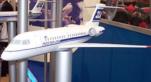 The Tupolev Tu-324 is a 30-50 seat regional passenger airliner. The jet will be twin powered by the General Electric CF34, Motor SICh D-436TP or the R-126-300 turbofan engines designed by the Moscow Soyuz corporation. The plane will be available as a corporate plane for 8-10 executives. The range for the 3 aircraft will be 2500 km, 5000 km and 7000 km. The cargo version can carry 3000 kg of cargo and having 5900 km range is also considered. The Tu-324 is designed to replace aging Yak-40, Tu-134, An-24 and An-26 on Russia's regional routes. ProductionThe executive version will be equipped with a satellite phone, FAX, and a PC outlet. The Tupolev Tu-324 will be able to operate from gravel and dirt airfields providing safety and comfort of the passengers. The Tupolev Tu-324 will be produced at the S.P.Gorbunov Aircraft Production Association in Kazan, Russia. The plane price will be beteween $19–23 Million USD. Variants