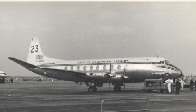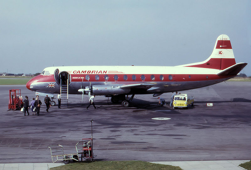 The Viscount was a British medium-range turboprop airliner first flown in 1948 by Vickers-Armstrongs, making it the first such aircraft to enter service in the world. It would go on to be one of the most successful of the first-generation post-war transports, with 445 being built. Design and developmentThe design resulted from the Brabazon Committee's Type II design, calling for a small-sized medium-range pressurised aircraft to fly its less-travelled routes, carrying 24 passengers up to 1,750 mi (2,816 km) at 200 mph (320 km/h). British European Airways (BEA) was involved in the design and asked that the plane carry 32 passengers instead, but remained otherwise similar. During development, Vickers advocated the use of turboprop power, believing piston-engines to be a dead-end in aviation. The Brabazon committee was not so convinced, but agreed to split the design into two types, the Type IIA using piston power, and the Type IIB using a turboprop. Vickers won the IIB contracts, while the IIA was the Airspeed Ambassador. Prototype aircraftThe resulting Vickers Type 630 design was completed at Brooklands by Chief Designer Rex Pierson and his staff in 1945, a 32-seat airliner powered by four Rolls-Royce Dart engines providing a cruising speed of 275 mph (443 km/h). An order for two prototypes was placed in March 1946, and construction started almost immediately. Originally to be named Viceroy, the name was changed after the partition of India in 1947. There was some work on replacing the Darts with the Armstrong Siddeley Mamba, but this was dropped by the time the prototypes were reaching completion. The prototype Type 630 flew on 16 July 1948. It was awarded a restricted Certificate of Airworthiness on 15 September 1949, followed by a full Certificate on 27 July 1950, and placed into service with BEA the next day to familiarize the pilots and ground crew with the new aircraft. However the design was considered too small and slow at 275 mph (443 km/h), making the per-passenger operating costs too high for regular service. The second prototype Viscount was named the Type 663 and was built as a test-bed. This aircraft fitted with two Rolls-Royce Tay (turbojet) engines and first flew in RAF Markings as VX217 at Wisley on 15 March 1950. It demonstrated at the Farnborough SBAC Show in September and was later used in the development of powered controls for the Valiant bomber. Subsequently, Boulton Paul Ltd used it as a test bed for electronic control systems until scrapping in the early 1960s. Type 700 Viscount