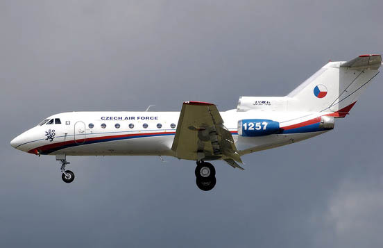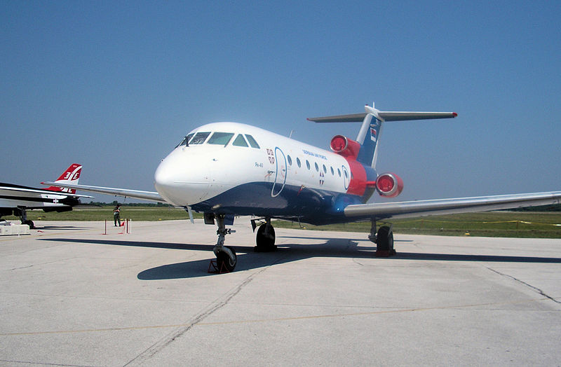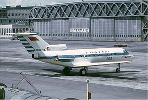 The Yakovlev Yak-40 (NATO reporting name: Codling) is a small, three-engined airliner that is often called the first regional jet transport aircraft. It was introduced in September 1968 with Aeroflot. HistoryThe Yak-40 was developed to meet a desire by Aeroflot to replace the Ilyushin Il-12, Il-14 and Lisunov Li-2, which, along with the An-2 biplane, served Aeroflot's regional and local routes. By the 1960s all these aircraft had become obsolete, and Aeroflot desired a single modern replacement aircraft for all of them to ease operating costs and maintenance. Aeroflot believed that a turboprop aircraft would best serve this need, and Yakovlev produced various studies using a variety of turboprop arrangements. In 1964 Yakovlev came to the conclusion that a STOL jet would better suit Aeroflot's needs, despite the fact that there was no desire for high speed, the emphasis instead being on reliability and the ability to operate in ICAO Category II weather conditions and from Class 5 airfields (unpaved strips shorter than 700m, 2,300 ft). DevelopmentIn order to achieve the STOL capability desired Yakovlev initially spent considerable effort exploring a VTOL arrangement (Yak-40 VTOL). Designs were studied that incorporated dedicated lift jets in pods mounted mid-wing, as well as designs incorporating the lift jets within the fuselage. Ultimately the concept of a VTOL aircraft was abandoned, being judged impractical. In 1964 the OKB received a GVF (civil air fleet) agreement to build a conventional 20/25 seat regional jet with unswept wings, powered by three new turbofans being developed by A I Ivchenko at Zaporozhye in the Ukraine. R S Petrov and M A Shcherbina were appointed chief engineers along with the founder's elder son, Sergei A Yakovlev, who was given his first major responsibility as a chief designer. The design evolved into a relatively slow jet transport, though this idea seemed to offer the best merger of simplicity, reliability, and low purchase and operating costs. Among the designs features was a 30,000-hour operating life, independence of sophisticated airport facilities, and the ability to meet foreign certification requirements. The final design was unusual in that the passenger compartment was ahead of the wing. Behind the wing was a short rear fuselage housing the three engines. The large tail features a leading edge sweep of 50 degrees, not for high-speed, but rather to move the high tailplane further back. Indeed, the tailplane does not extend to the fin's leading edge, but is mounted about one fifth the way back. Because of its short movement arm the the fin itself had to be somewhat huge. The wing was made of left and right halves joined at the centerline, with the main spar running from wingtip to wingtip, and auxiliary spars front and rear. Virtually the entire wing between the main and front spars formed internal fuel tanks with a capacity of 3,800 liters (839.9 gallons). The fuselage was a simple ring frame with stringers and measured 2.4m (94.5in) in diameter. The nose section was made separately, with a cockpit floor slightly higher than the cabin floor. The cockpit was arranged for two pilots, with a wide center console. The cabin was fully pressurized, and initially measured 6.7m long on the prototype, but was later extended aft with an extra window being added on each side, to a length of 7.07m (23 ft 2 3/8 in). Seating was for twenty-four passengers in a two-plus-two configuration, with a luggage bay and toilet at the rear. A shelf for carry-on bags was located along the right side. An outward opening service door was located in front on the left, and eight circular windows were installed on each side, the rearmost being escape hatches. The main passenger door was located in the rear pressure bulkhead, allowing passengers to board and exit the aircraft from the rear down a hydraulically operated rear stairway. The three AI-25 engines were especially designed for the aircraft, and featured a two-shaft turbofan with an eight-stage compressor and a bypass ratio of 2.15. Takeoff thrust was rated at a mere 1,500 kg (3,307lbs), a very low thrust figure for a commercial airliner. Dry weight was 320 kg (705lb). The engines had no jetpipes, and initially no thrust reversers. The undercarriage was a conventional tricycle arrangement. Each wheel had a multi-disc brake with the latest anti-skid control systems, while the tires were wide, low pressure units for operations on unpaved runways. The wheels had no fairings when retracted, and almost met at the centerline. TestingThe first of five prototypes (SSSR-1966) was first flown on 21 October 1966 by Yakovlev test pilots A I Kolossov and Yu B Petrov. This aircraft was followed by 19661, 1967, 19671 and 19672. With so many flying prototypes it was possible to achieve certification by 1968. One year earlier, in 1967, large orders were place at the factory at Saratov, supported by Smolensk producing specific parts. Initial series production aircraft differed from the prototypes mainly in having the longer cabin and a back-sloping inlet to the number 2 engine. The ASCC reporting name is "Codling". Second seriesThe second series was introduced in 1969 and featured clamshell thrust reversers on all three engines. The main undercarriage was strengthened, and a ninth row of seats was installed, bringing the seating capacity to twenty-seven. The fuel tank capacity was also increased to 3,910 liters (860 gallons). Third seriesIntroduced in 1973, the third series was cleared to significantly higher weights, giving customers the option of an interior for thirty-two passenger. The upper tailplane bullet fairing was removed from this and all subsequent models. Forth seriesThe final series was introduced in 1975. Payload was increased to 3,200 kg (7,055lb), and the interior could be arranged into two classes of seating, or for rapid conversion from passengers to cargo. Yak-40KA few of the forth series were built as a special cargo versi