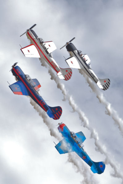 The Yakovlev Yak-52 (Як-52) is a Soviet primary trainer aircraft which first flew in 1976. It is still being produced in Romania by Aerostar, which gained manufacturing rights under agreement within the now defunct COMECON socialist trade organisation. The Yak-52 was designed originally as an aerobatic trainer for students in the Soviet DOSAAF training organisation, which trained both civilian sport pilots and military pilots. Since the early 1990s and the fall of the Soviet Union, many Yak 52s have been exported to the west. Of the approximately 1,800 produced to date, most now fly in the United States, United Kingdom, New Zealand, Australia and other western countries. Design and developmentA descendant of the single-seat competition aerobatic Yakovlev Yak-50, the all-metal Yak-52 is powered by a 268 kW (360 hp) Vedeneyev M14P 9-cylinder radial engine. The aircraft has inverted fuel and oil systems permitting inverted flight for as long as two minutes. The engine drives a two-bladed counter-clockwise rotating, variable pitch, wood and fiberglass laminate propeller. At 998 kg (2,200 lb) empty weight, the Yak-52 is responsive and very capable as an aerobatic aircraft. Yet it is also easy to fly and land. It has been used in international aerobatic competition up to the Advanced level. It is stressed to +7 and –5 Gs, rolls (to the right) at 180 degrees/second and is capable of every manoeuvre in the Aresti catalog. The Yak-52, like most Soviet military aircraft, was designed to operate in rugged environments with minimal maintenance. One of its key features, and a radical departure from most western aircraft, is its extensive pneumatic system. Engine starting, landing gear, flaps, braking and steering are all pneumatically actuated. Spherical storage bottles for air, replenished by an engine driven compressor, are situated behind the rear cockpit and contents displayed on the instrument panels. The operating pressure is between 10 and 50 bars (145 and 725 psi) and an emergency circuit is reserved for lowering the undercarriage if the normal supply is exhausted or the compressor fails. Additionally both main and reserve bottles can be charged from a port on the ground with compressed air, usually from a SCUBA type air bottle. The steering/braking arrangement, especially, takes some adjustment for flyers accustomed to hydraulics, because the plane uses differential braking controlled by rudder pedals and a hand operated lever on the control stick. The tricycle landing gear is fully retractable, but it remains partially-exposed in the retracted position, affording both a useful level of drag in down manoeuvres and a measure of protection should the plane be forced to land "wheels up." A number of "westernised" versions of the Yak-52 are now produced. The replacement of the existing Soviet avionics, fitting of a three-blade aerobatic propeller (Yak-52W) and conversion to conventional "tail-dragger" landing gear (Yak-52TD) are the major modifications to the standard aircraft. There is also a factory produced Yak-52TW tail-dragger version which looks like a small Yak-11. The TW has some nice features such as an extra 120 l (32 US gal) of fuel capacity in two extra wing tanks, a 298 kW (400 hp) engine designated M-14PF, an electric start, and modern instruments. On April 16, 2004, a modernised variant Yak-52M was flown in Russia. It is fitted with modernised M-14Kh engine, three-blade propeller, ejection seats and other modifications. Military operators