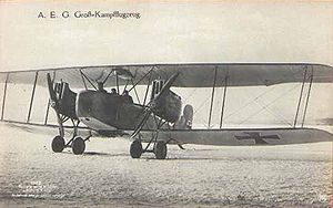 The AEG G.IV was a biplane bomber aircraft used in the World War I by Germany. It was developed from the AEG G.III, with refinements to power, bomb-load, and dimensions. Serving late in the war, the AEG G.IV managed to achieve some operational success in reconnaissance and combat roles. Coming into service in late 1916, it featured a bomb capacity twice as large as that of the AEG G.II, but was still considered inadequate in terms of offensive capacity and performance. Further improvements led to the development of the G.V, but the Armistice came before the replacement could become operational. Design and developmentThe Allgemeine Elektricitäts-Gesellschaft (A.E.G.) G.IV was derived from the earlier G.III. Designed as a tactical bomber, the relatively modern technology included onboard radios and electrically heated suits for the crew. The AEG G.IV also had a quality that endeared it to the men who flew it – it was an extremely rugged aircraft. Unlike the other German bombers such as the Gotha and the Friedrichshafen, the AEG featured an all metal, welded tube frame. Well equipped with armament, although the rear gunner’s cockpit was on the top of the fuselage, the position was equipped with a hinged window in the floor for viewing and fending off pursuing aircraft. The AEG G.IV medium bomber was converted into an armored, antitank gunship, the G.IVk (Kanoe). It never saw service. Operational historyThe AEG G.IV bomber entered service with the German Air Force in late 1916. Because of its relatively short range, the G.IV served mainly as a tactical bomber, operating close to the front lines. The G.IV flew both day and night operations in France, Romania, Greece and Italy, but, as the war progressed, the AEG G.IV was restricted increasingly to night missions. Many night operations were considered nuisance raids with no specific targets, but with the intention of disrupting enemy activity at night and perhaps doing some collateral damage. The AEG G.IV carried a warload of 400 kg (880 lb). While Gotha crews struggled to keep their heavy aircraft aloft, the AEG was renowned as an easy machine to fly. Some G.IV crews of Kampfgeschwader 4 are known to have flown up to seven combat missions a night on the Italian front. A notable mission involved Hauptmann Hermann Kohl attacking the railroad sheds in Padua, Italy in his G.IV bomber. A single example is preserved at the Canada Aviation Museum. This example is significant not only as the only one of its kind in existence, but as the only preserved German, twin-engined combat aircraft from World War I. Variants