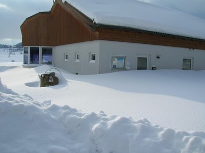 Der kleinere Hangar, quer zur Piste, hat gemauerte Wunde sowie eine Holz-Dachkonstruktion