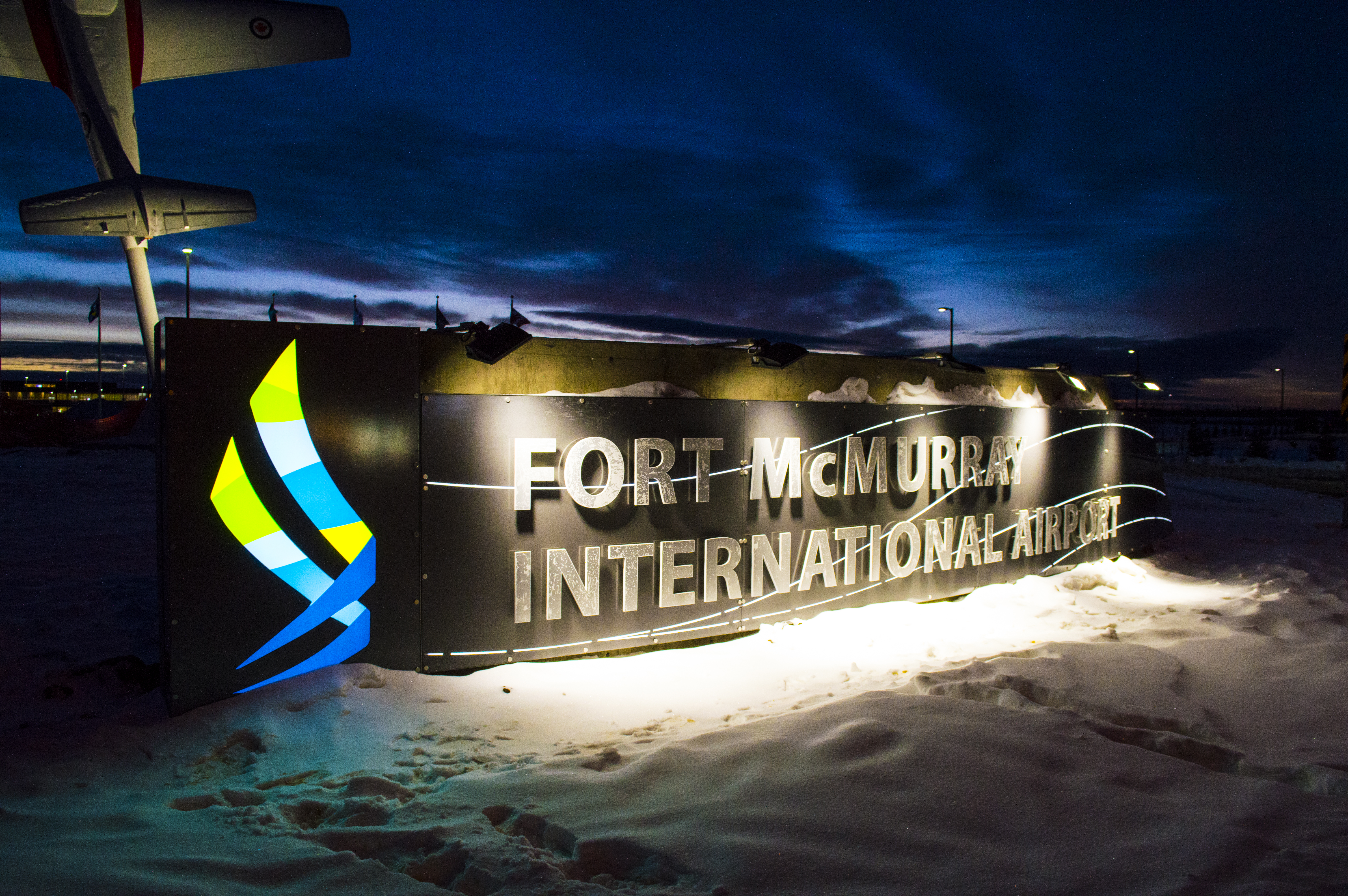 Exterior art piecesA trident of light towers varying between 5 m to 7 m (18 to 25 ft) in height can be seen by passengers before the main terminal entrance. The three towers are illuminated after sunset with colors similar to the aurora borealis. YMM also has two 9 m (30 ft) illuminated welcome signs with a replica of a Canadian Forces Snowbirds aircraft. AccessibilityThe new YMM airport terminal is outfitted with automatic doors, ramps and lifts, and the food court and passenger lounges have barrier-free seating areas. Accessible parking stalls are located closest to the main terminal, with users required to display a disable person or veteran licence plate, or a disabled parking placard in the windshield. Persons with wheelchairs or other mobility-assist devices can arrange for special assistance with airlines. Ramps and curb cuts are available at both arrivals and departures, and an enlarged drop-off stall for wheelchairs is located on the departures level. YMM has washrooms accessible to passengers with either limited mobility, have infants and young children, or require a companion. Washrooms have screen walls in place of doors, stalls and sinks that are accessible to everyone, low countertops and automated faucets and paper towel dispensers. The terminal has a companion care rest room in the arrivals hall for travellers needing companion assistance. Family rooms are located across from all common washrooms. Certified service animals such as seeing-eye dogs are allowed in the terminal. The outdoor courtyard is also a pet relief area, equipped with plastic bags and animal waste disposal receptacles. Visitor and Customer Information CentreYMM hosts a Visitor and Customer Information Centre through partnerships with the Regional Municipality of Wood Buffalo and Fort McMurray Tourism. The centre is in the arrivals hall and available to help passengers. Some of the services offered include finding accommodations, securing transportation or assisting visitors in planning their stay while they are in Fort McMurray. Community involvementYMM's Community Investment Program (CIP) helps community organizations in three core areas: