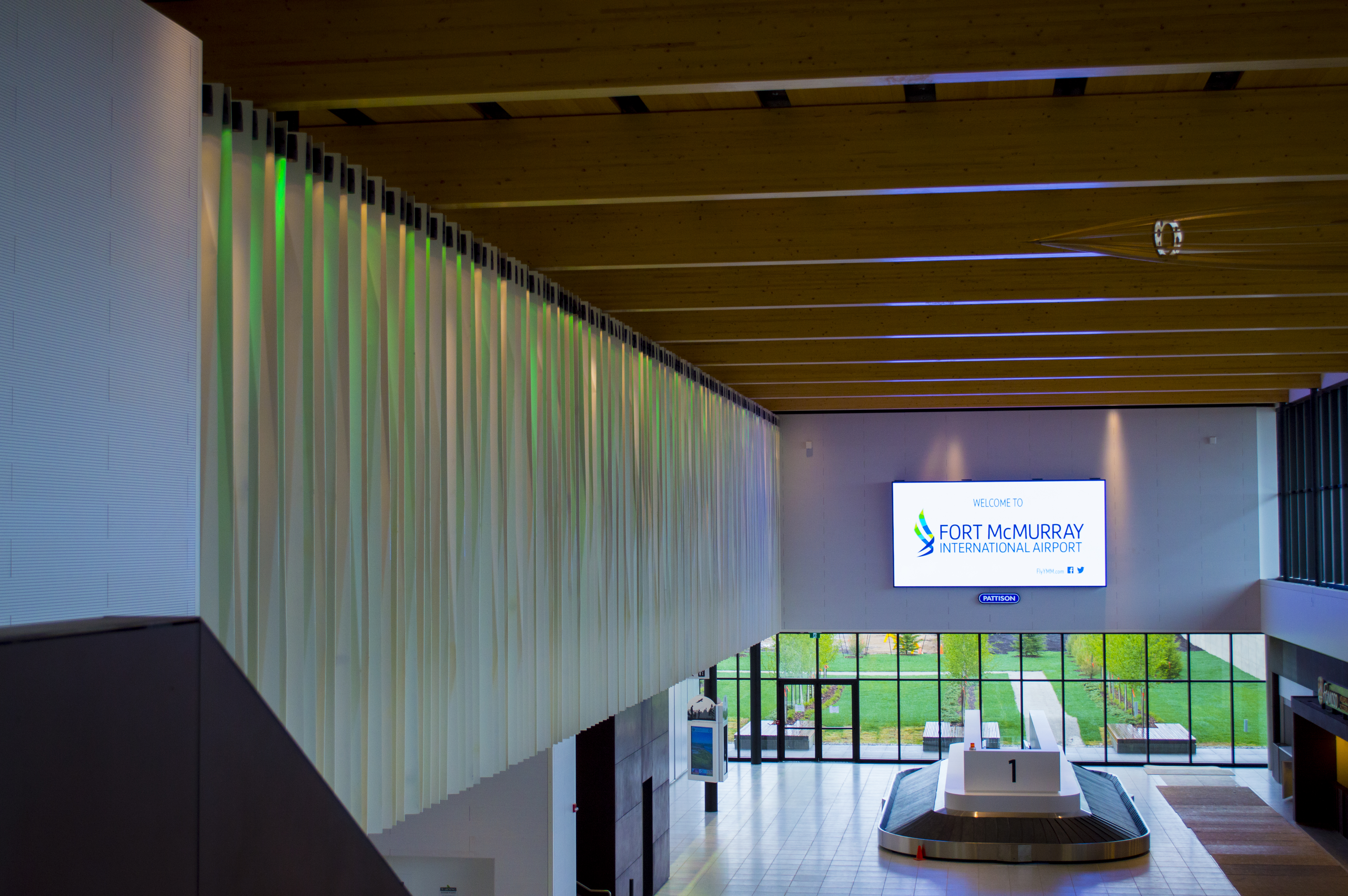 On April 22, 2015, YMM received first place in the «Best Food & Beverage Program - Medium/Small Airport» category at the Airports Council International - North America (ACI-NA) Excellence in Airport Concessions Awards. North TerminalThe North Terminal was originally built for both commercial and private passenger services. After the opening of the new main terminal in 2014, the building was renovated and re-opened as the North Terminal to serve workforce charters, corporate fliers and cargo. The North Terminal supports about 250,000 workers a year, or 20 per cent of all YMM passengers annually. Charter carriers, including Canadian North, Enerjet, Flair Air and North Cariboo Air operate through the terminal. The terminal has retail, food and beverage, and car rental services. It also handles air cargo operations such as a dedicated cargo depot, storage and sorting space as well as ramp space for cargo aircraft. ArchitectureThe interior of YMM's main terminal has a unique northeastern Alberta theme, emphasizing the boreal forests that cover the Wood Buffalo region's landscape and the green, blue and gold colours of the aurora borealis that are prominently seen in the night sky of the Canadian north. The main terminal architecture was designed by office of mcfarlane biggar architects + designers inc (OMB) of North Vancouver, British Columbia. The design was recognized as one of 11 recipients of the 2013 Canadian Architect Award of Excellence, for embodying qualities of innovation and overall design excellence. In 2018, it was one of 12 recipients of the Governor General’s Medals in Architecture. Pine roofThe most striking feature is unique laminated pine wood beam used to support the roof, which is the largest of this type of material in North America. Some 644,663 kg (1.4 million lbs) of pine wood material was used to build the roof using engineered timber reclaimed from forested areas in interior British Columbia that were devastated by pine beetle infestation in the mid-2000s. The exposed mass timber structure complements the other refined yet durable materials used for the terminal's interior, including triple glazed windows, terrazzo flooring and acoustic wood panels. Public artYMM has a collection of art by artists locally and across Western Canada that showcase the unique look and character of Fort McMurray and the Wood Buffalo region. These art pieces include: