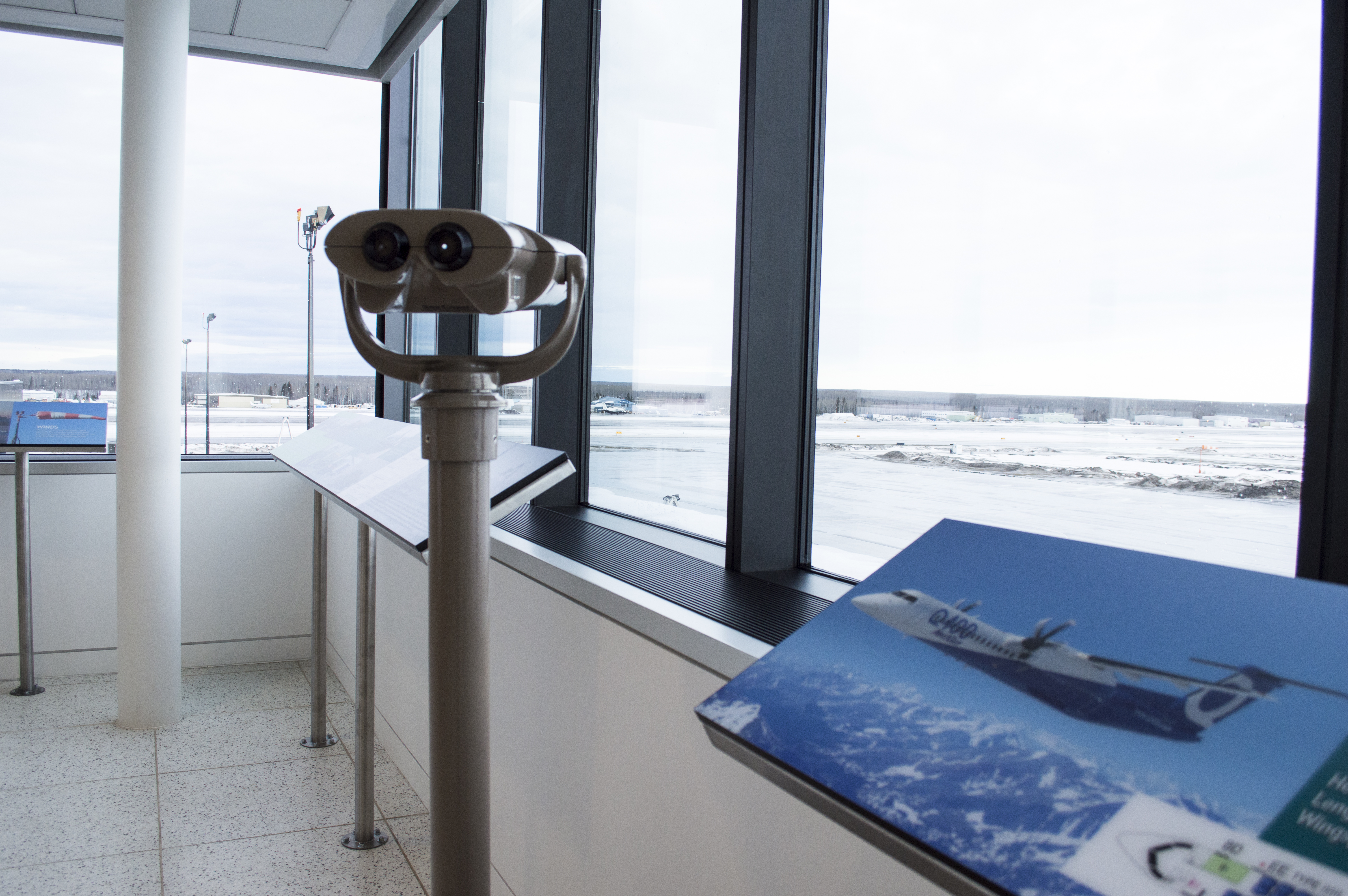 The Northern Lights mural in the arrivals hall features the aurora borealis and boreal forests for the Wood Buffalo region, and unites all the other thematic features of the main terminal. Observation areaYMM has an interactive public observation area with educational exhibits showcasing Fort McMurray's aviation history.These exhibits include: