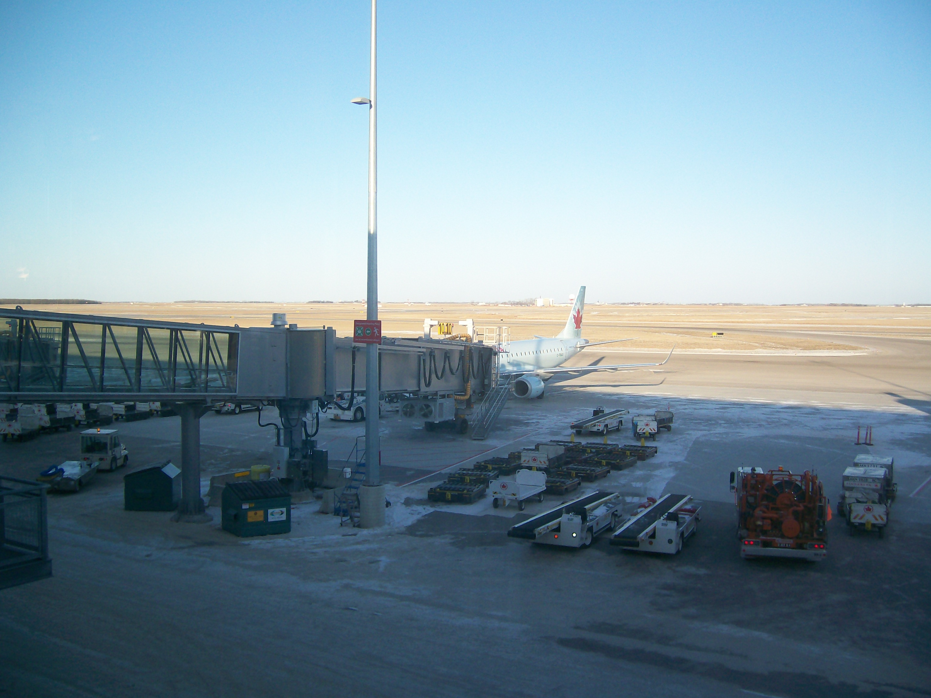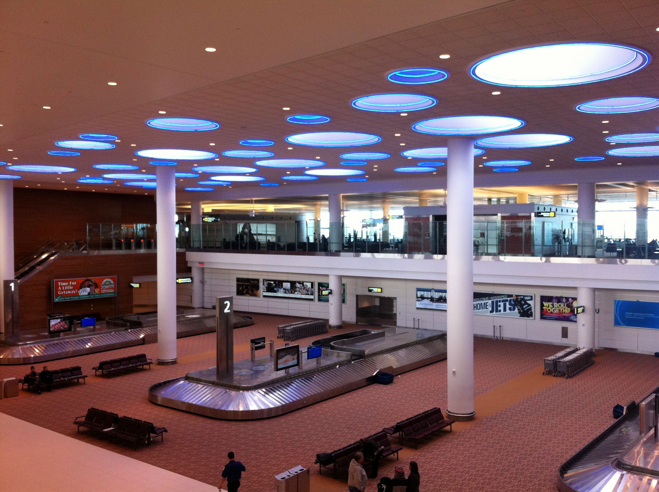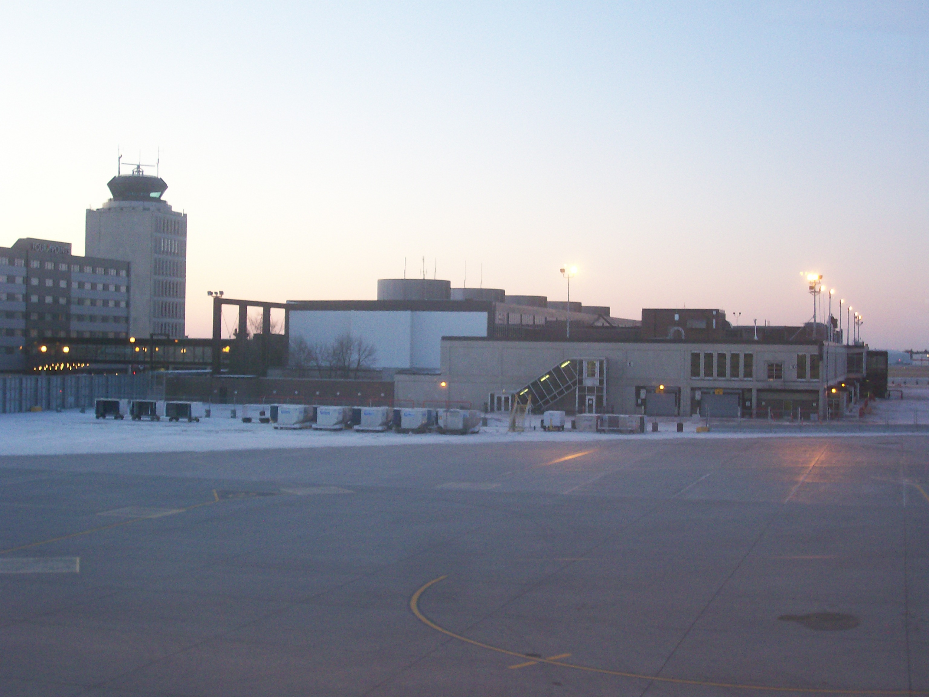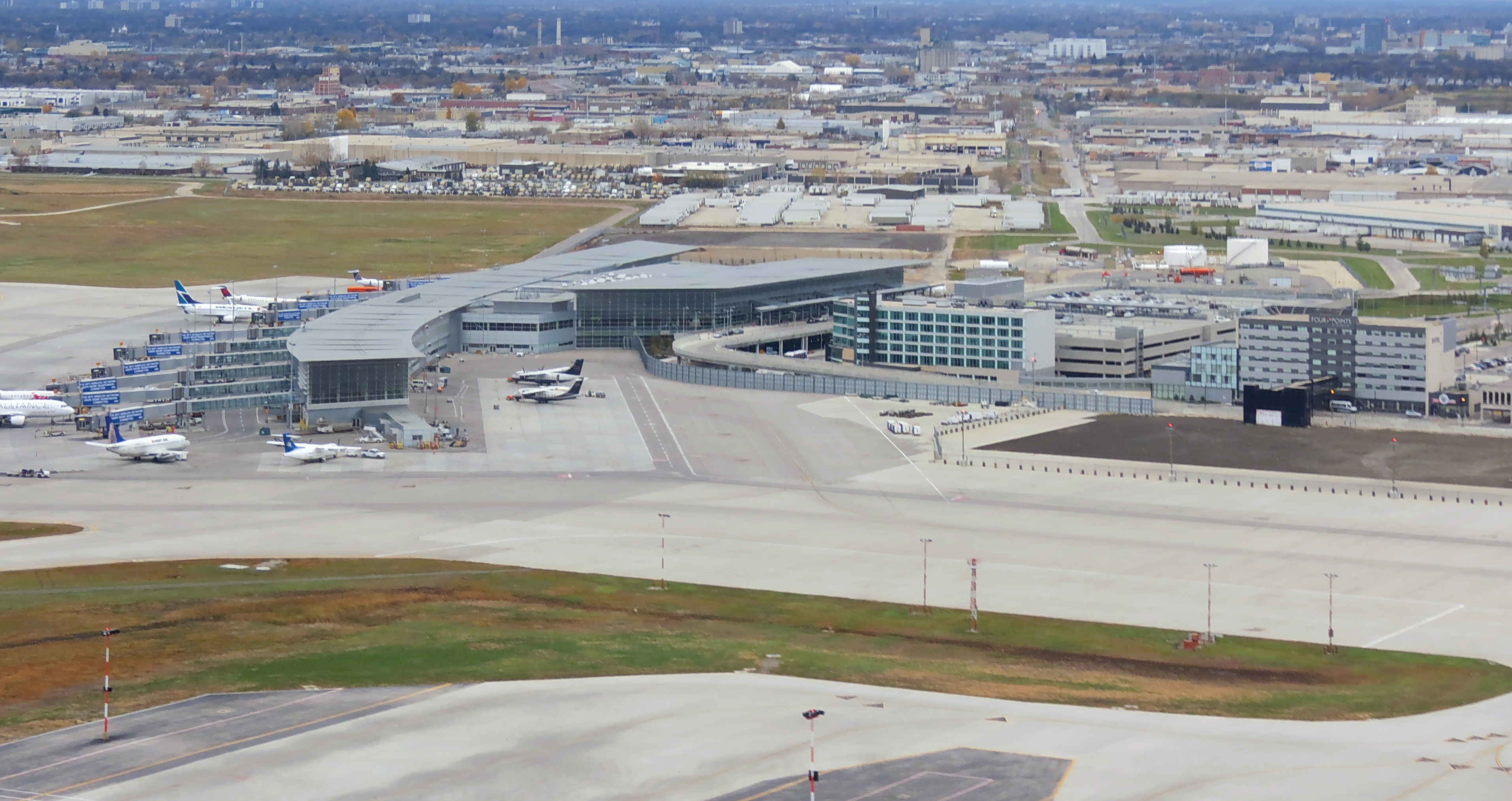 HistoryThe airport opened in 1928 as Stevenson Aerodrome in honour of the noted Manitoba aviator and pioneer bush pilot, Captain Fred J. Stevenson. Stevenson Aerodrome, also known as Stevenson Field, was Canada's first international airport with Northwest airways (which became Northwest Airlines) inaugurating a passenger and mail service between Winnipeg and Pembina, North Dakota on February 2, 1931. By 1935, Northwest Airlines was operating daily service from the airport with Hamilton H-47 prop aircraft on a routing of Winnipeg - Pembina, ND - Grand Forks, ND - Fargo, ND - Minneapolis/St. Paul, MN - Milwaukee, WI - Chicago, IL. The City of Winnipeg and the Rural Municipality of St. James agreed to develop Stevenson Field as a modern municipal airport in 1936. In 1938 the Manitoba Legislative Assembly passed the St. James-Winnipeg Airport Commission Act creating a commission of the same name with full control over the operation of the airport. In 1940 during the Second World War the Government of Canada placed the airport under the direction of the Minister of Transport and the Royal Canadian Air Force where it remained until 1997. Post WarIn 1962 Stevenson Field was officially renamed Winnipeg International Airport and in 1997 the airport was transferred to the control of the Winnipeg Airports Authority. The airport was briefly served by Scandinavian Airlines during the mid 1950s on the world's first regular Polar route, which linked Copenhagen and Los Angeles with Douglas DC-6B propliner flights via Søndre Strømfjord and Winnipeg. In 1962, Trans-Canada Air Lines (TCA, now Air Canada) was operating weekly nonstop service between Winnipeg and London Heathrow Airport with Douglas DC-8 jetliners. The original main terminal building was built in 1964, and was designed by the architectural firm of Green Blankstein Russell and Associates (subsequently GBR Associates and Stantec Limited). It was expanded and renovated in 1984 by the architectural firm of IKOY, and a hotel was built across from the terminal in 1998. The original main terminal building was closed on Sunday October 30, 2011 and has since been demolished. Two airlines operating jet aircraft in passenger service were previously based at the airport: Transair (Canada) and Greyhound Air. According to its March 18, 1974 timetable, Transair was operating Boeing 737-200 and Fokker F28 Fellowship jets on scheduled flights in Manitoba and also as far west as Yellowknife and as far east as Toronto from its Winnipeg hub in addition to operating charter services from the airport with Boeing 707 jetliners. The August 1, 1996 Greyhound Air timetable lists nonstop domestic flights operated with Boeing 727-200 jetliners from the airport to Calgary, Edmonton, Hamilton, Kelowna, Ottawa, Toronto and Vancouver with Winnipeg serving as a connecting hub for the airline. On December 10, 2006, the Minister of Transport, Lawrence Cannon, announced Winnipeg International Airport was to be renamed Winnipeg James Armstrong Richardson International Airport in honour of the influential businessman and pioneer of Canadian commercial aviation from Winnipeg. FacilitiesMain TerminalWinnipeg's main airport terminal was designed by Pelli Clarke Pelli Architects and Stantec. The terminal's design was inspired by the City of Winnipeg's distinctive landscape and the province of Manitoba's vast prairies and sky. It was the first airport terminal in Canada to be LEED-certified for its environmentally friendly concept, design, construction and operation. The terminal was constructed in two phases, with construction beginning in 2007 and ending on October 30, 2011 when it was officially opened to the public. Prior to the opening of the current main terminal building, a multi-level access road and four-level, 1,559 stall parkade were both opened in November 2006. All airlines serving Winnipeg International Airport operate at the main terminal building, with the exception of Perimeter Aviation. Air Canada operates a Maple Leaf Lounge located in the domestic/international departures area, and a "pay-in" lounge, operated by Plaza Premium Lounge, is also located in the domestic/international departures area. Free WiFi is provided by the Winnipeg Airports Authority throughout the entire main terminal building. Perimeter TerminalPerimeter Aviation is a regional airline that operates its own small, exclusive terminal building at Winnipeg International Airport to facilitate its passenger, cargo and charter services. Perimeter Aviation does not use the main terminal building due to its varied operations to small remote communities throughout Northern Manitoba and Northwestern Ontario using small propeller aircraft, with which regular airport terminal services (jet bridge, catering, etc.) are unnecessary and can actually be a hindrance to day-to-day operations. The Perimeter Aviation terminal building is located 2.6 kilometres (1.6 mi) south of the main terminal building. Other facilitiesA large Canada Post mail processing facility was opened at the airport site on June 4, 2010. The 23,225-square-metre (249,990 sq ft) facility is located east of the main terminal building, just north of Wellington Avenue. Three hotels are located on site, adjacent to the main airport terminal. Richardson International Airport is included in a new 20,000-acre (8,100 ha) dry port created by provincial legislation - CentrePort Canada Act, C.C.S.M. c. C44 - that will offer investment opportunities for distribution centres, warehousing and manufacturing. CentrePort Canada will allow companies to take advantage of the cargo capabilities of Richardson International Airport, as well as serviced land, a mid-continent location and highway and rail transport. On April 14, 2009, Prime Minister Stephen Harper with Premier Gary Doer announced at James Richardson that both the Federal and Provincial governments will contribute $212.5 million towards a divided four-lane expressway called CentrePort Canada Way. It