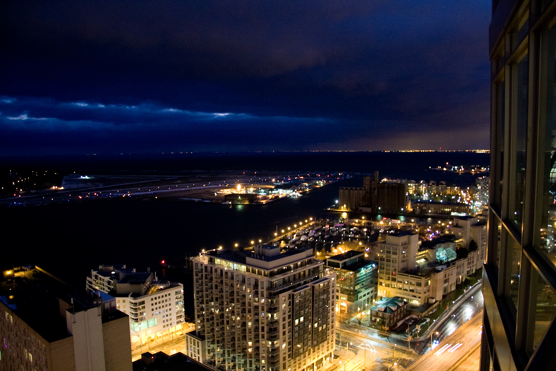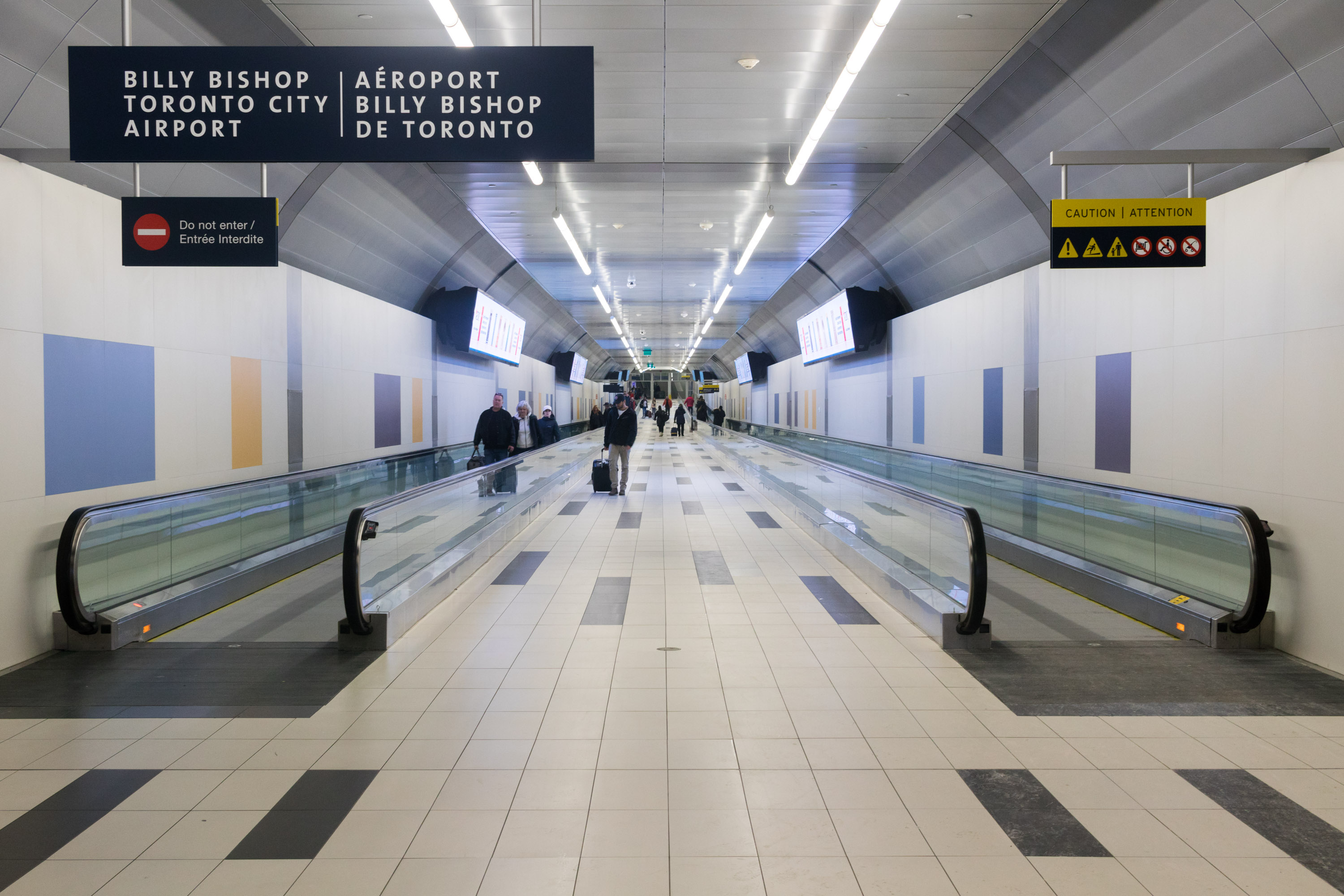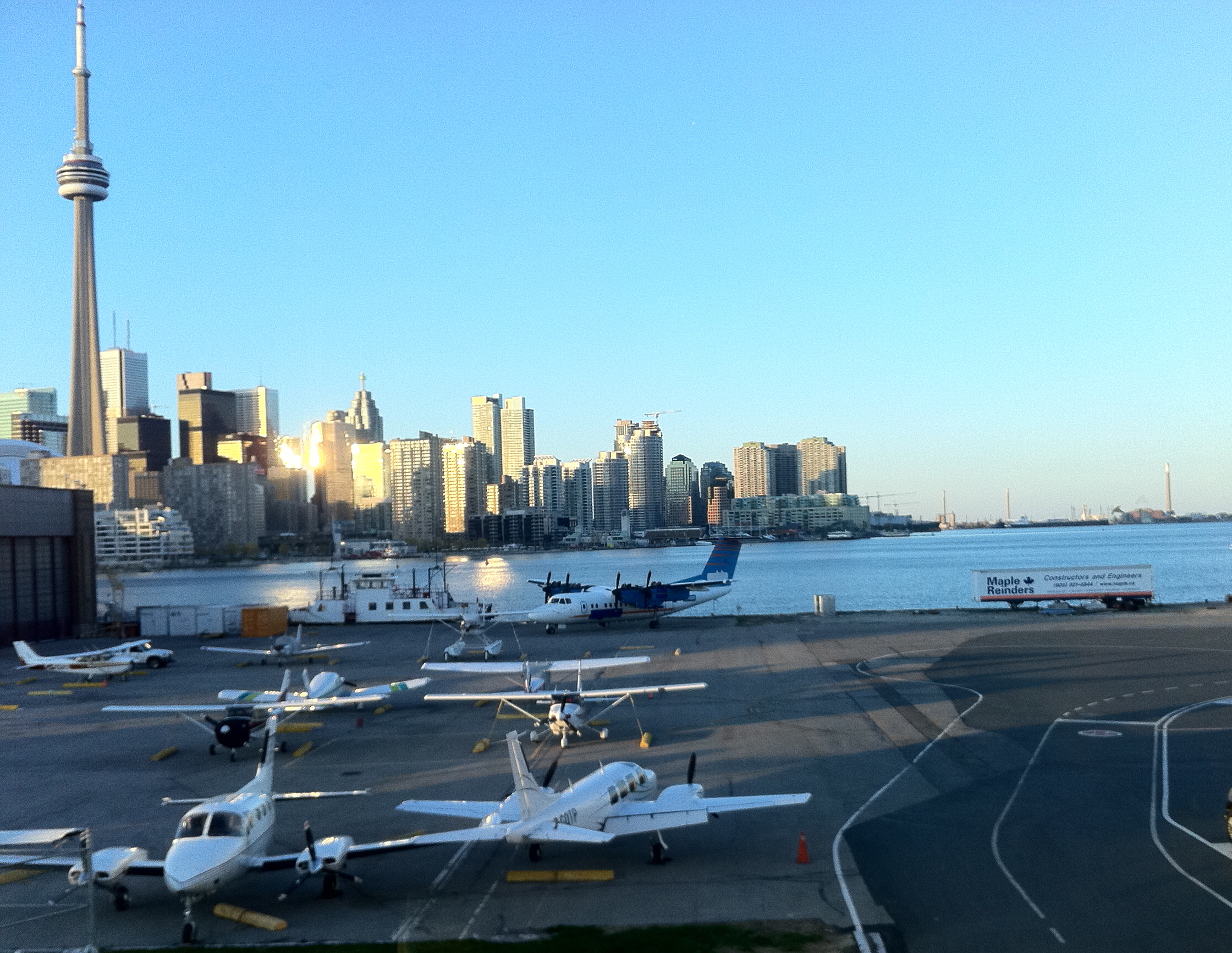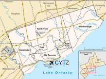 DescriptionThe airport is located on the Toronto Islands, south-west of Downtown Toronto. The airport has one main east–west runway, a shorter runway 20 degrees off, and a seaplane base, Billy Bishop Toronto City Water Aerodrome. The airport is used for regional airline service and for general aviation, including medical emergency flights (due to its proximity to downtown hospitals), small charter flights, and private aviation. Under its operating agreement, jet aircraft are banned from the airport, with the exception of MEDEVAC flights. There is one passenger terminal at the airport, built in 2010. The airport is operated as a division of Ports Toronto (formerly Toronto Port Authority (TPA)), a federal corporation, which also manages Toronto harbour. The airport is classified as an airport of entry by Nav Canada and is staffed by the Canada Border Services Agency (CBSA). The CBSA officers at the airport can handle aircraft with up to 90 passengers. The airport does not have United States border preclearance, although this has been approved by both Canada and US governments. The airport's hours of operation are 6:45 a.m. to 11:00 p.m., except for MEDEVAC flights. The airport's hours are governed by the 2003 update of the Tripartite Agreement, which set the hours of operation. Airfield crash fire rescue and EMS are provided by the Billy Bishop Airport Emergency Response Service, backed up by Toronto Fire Services and Toronto EMS. View from the southwest The airport is accessible from a pedestrian tunnel at the foot of Eireann Quay, which is free to use. From a pavilion on the mainland end, a 240 m (800 ft) pedestrian tunnel and a tunnel for sewage and water mains connect to the airport. The pedestrian tunnel has moving sidewalks, with elevators at both ends. On the island side, an escalator serves patrons. A consortium known as Forum Infrastructure Partners, composed of firms Arup, PCL and Technicore, designed, built, financed and maintains the tunnel. A ferry operates between the same location and the airport every 15 minutes from 5:15 a.m. to midnight (the 5:15 ferry is for airport staff; airline passengers can begin crossing at 5:30). A free shuttle bus service operates between the intersection of York Street and Front Street and the airport. There is a taxi stand at the dock. Short-term and long-term parking is available at the dock and on the island. There is no curb-side parking. The 509 Harbourfront streetcar line, which connects to the subway, serves the intersection of Bathurst Street and Queens Quay, one block north of the ferry dock. The airport imposes a CA$20 airport improvement fee surcharge on each passenger boarding scheduled flights. Since 2015, Billy Bishop has participated in customer surveys with the "Airport Service Quality Survey" of Airports Council International. In March 2017, the airport was named the "Best Airport in North America" in two categories based on 2016 surveys. History1930s–1940sThe first proposal to build an airport was made in June 1929 by the Toronto Harbour Commission. The Commission proposed a four-stage plan, starting with an "air harbour" for seaplanes, while the final stages proposed filling the then-regatta course lagoon between the sandbar and Hanlan's Point. Toronto City Council at that time agreed to the "air harbour" but "in no way-either by implication or suggestion- implies approval of the ultimate development of a combined air harbour and airport." In August 1935, Council reversed its position and approved the airport project by a vote of 15–7, against the opposition of Toronto mayor Sam McBride (who was serving as a Councillor at the time). City Council received approval from the Government of Canada to spend $976,000 ($17.4 million in 2017 dollars) on a tunnel under the Western Gap. That fall, after construction began, a federal election was held and William Lyon Mackenzie King was elected as prime minister. King's government reversed the previous government's decision and cancelled the tunnel. Trans-Canada Air Lines was expected to begin operations in 1937, so in November 1936, City Council (without McBride, who died days earlier) formed an "Advisory Airport Committee" to advise on where to build a municipal airport. The committee proposed several locations and of these two were approved by the Government of Canada, which agreed to fund one-quarter of the project. The two sites were the Island and Malton, north-west of Toronto. A seaplane and land airport would be built at the island, and an auxiliary field was to be built at Malton. The project would fill in the regatta lagoon and extend the airport site on both the east and west sides. After two days of debate, City Council voted 14–7 to approve the construction of both airports. The site of the airport had been home to a baseball stadium, numerous cottages, amusement park attractions and the regatta course. The 54 cottages and their cottagers were moved to today's Algonquin Island (then named Sunfish Island). The seaplane base was first used in 1938. The paved runways and the terminal building were opened in 1939. In April 1939, Toronto Council voted to name the airport Port George VI Island Airport to commemorate an upcoming visit by King George VI in May 1939. The first commercial passenger flight to the airport was a charter flight carrying Tommy Dorsey and his swing band for a two-day engagement at the Canadian National Exhibition on September 8, 1939. It was also the first airliner from the United States to arrive in Toronto. A 48-person cable ferry service was inaugurated to the airport. The era of the Royal Norwegian Air Force at the airport During World War II, the island airport became a military training base. From 1940 until 1943, the Royal Norwegian Air Force used the island airport as a training facility. Barracks were built nearby on the mainland at the foot of Bathurst Street. The nearby 'Little Norway Park' is named in remembrance of the Norwegian communit