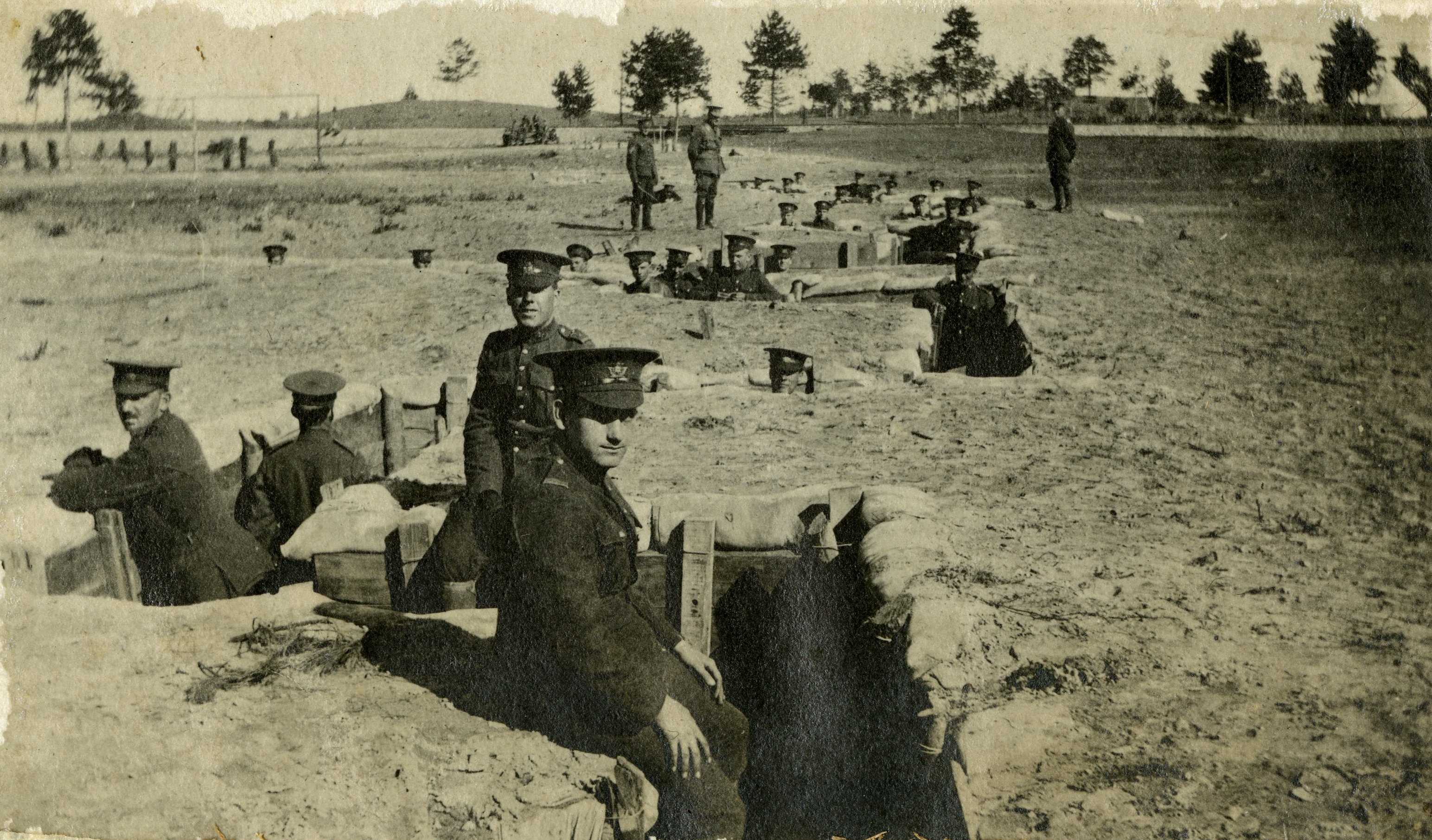 HistorySoldiers training for trench warfare at Camp Borden in 1916. Royal Canadian Air Force fire house, Camp Borden, Ontario At the height of the First World War, the Borden Military Camp opened at a location on a glacial moraine west of Barrie in 1916 to train units for the Canadian Expeditionary Force. It was named for Sir Frederick Borden, former Minister of Militia. In May 1916, the Barrie and Collingwood companies of the 157th Battalion (Simcoe Foresters), CEF (perpetuated today by The Grey and Simcoe Foresters ), under the command of Lieutenant-Colonel D.H. MacLaren, began construction of the camp. Camp Borden was selected in 1917 for a military aerodrome, becoming the first flying station of the Royal Flying Corps Canada. During the inter-war period, the aerodrome was used as the training location for the nascent Royal Canadian Air Force (RCAF) and was renamed RCAF Station Borden. Camp Borden's training grounds were expanded in 1938 to house the Canadian Tank School. The Siskins were a Royal Canadian Air Force (RCAF) aerobatic flying team that was established in 1929 at Camp Borden. During the Second World War, both Camp Borden and RCAF Station Borden became the most important training facility in Canada, housing both army training and flight training, the latter under the British Commonwealth Air Training Plan (BCATP). The BCATP's No. 1 Service Flying Training School (SFTS) was located here until 1946. Relief landing fields were located at Alliston and Edenvale. A third landing field, known locally as Leach's Field, was operated by Camp Borden from the 1920s to the 1950s. The L-shaped airstrip was rudimentary; the "runways" at Leach's Field utilized the existing ground surface. It was primarily used for touch-and-go flying. During the Cold War, Borden's importance as an RCAF facility in Ontario declined in favour of CFB Trenton, CFB Uplands and CFB North Bay. However, its use as an army facility stayed consistent until 1970 when a major reorganization of the combat arms' schools resulted in the transfer of the Infantry School and Armoured School to CFB Gagetown in New Brunswick. On the other hand, numerous "purple" (i.e. tri-service) schools were established or expanded from existing service training establishments, including the Canadian Forces School of Administration and Logistics, the School of Aerospace Ordnance Engineering and the Canadian Forces Health Service Training Centre. The February 1, 1968 unification of the RCAF with the Royal Canadian Navy and the Canadian Army resulted in the creation of the Canadian Forces. The military facilities consisting of Camp Borden and RCAF Station Borden were grouped under a new name, Canadian Forces Base Borden (CFB Borden). The aerodrome was closed in 1970 and the base saw use as a regular and reserve training facility for Canadian Forces Land Force Command (the army), as well as hosting various land-based training courses for Canadian Forces Air Command (the air force). In a 1990s reorganization of the Canadian Forces following the end of the Cold War, CFB Borden's air force training facilities were grouped under the name 16 Wing Borden. The eight surviving Royal Flying Corps hangars at the base have been designated a National Historic Site of Canada. PlaqueThe Ontario Heritage Foundation, Ministry of Culture and Recreation erected a plaque in 1976.