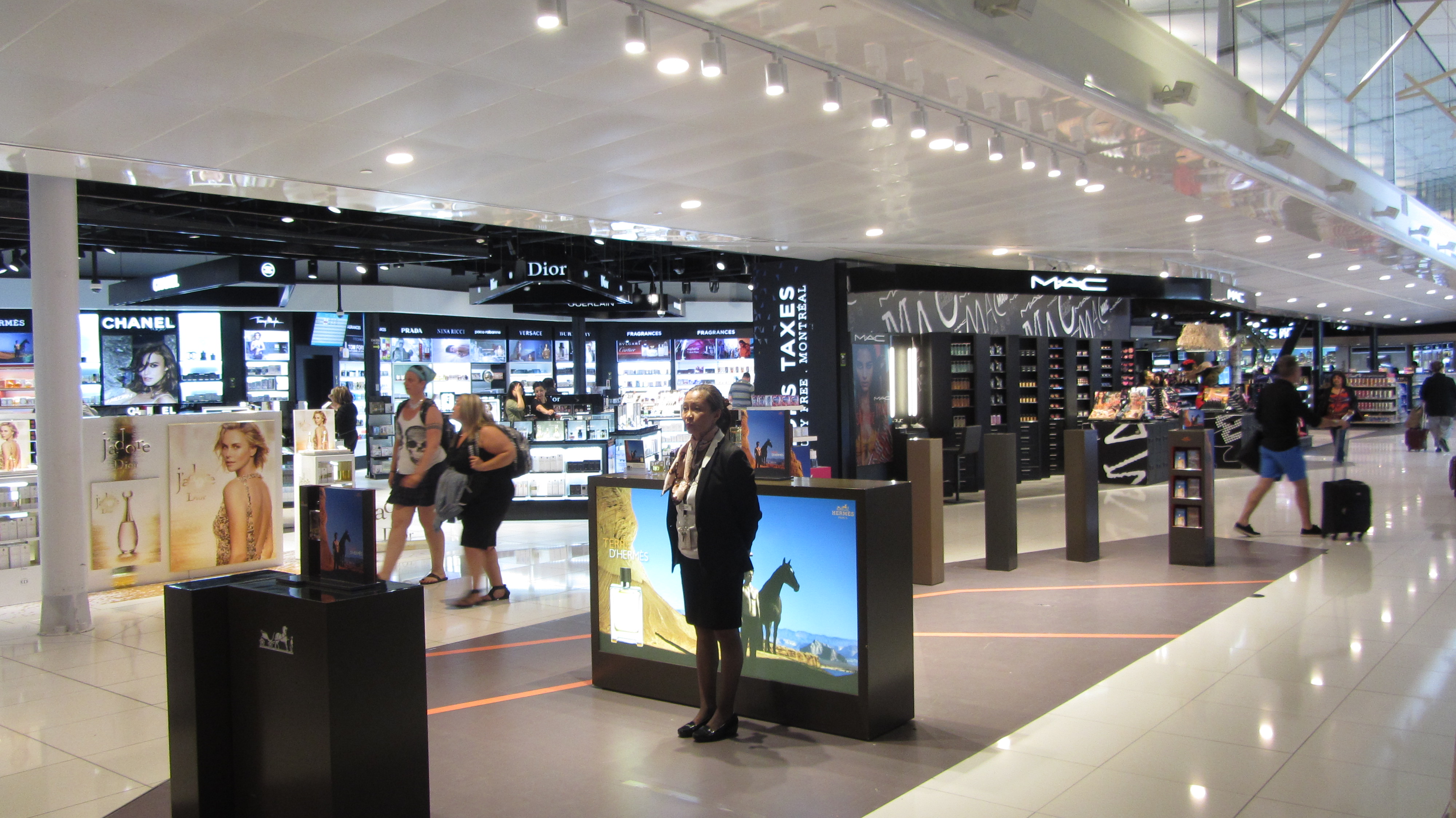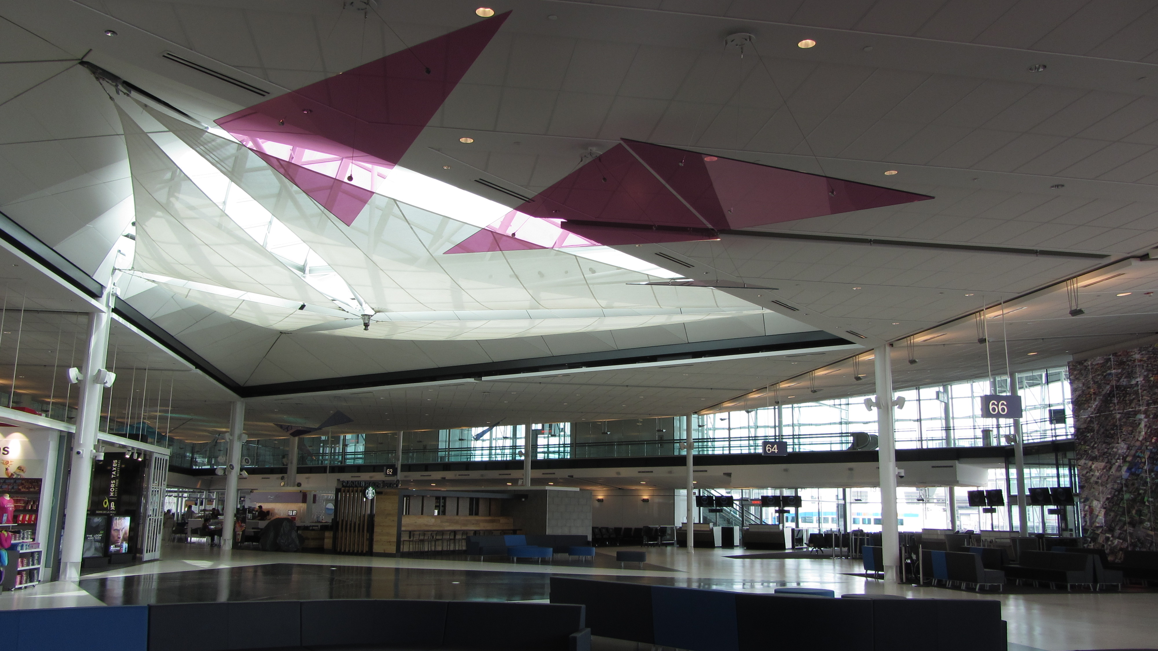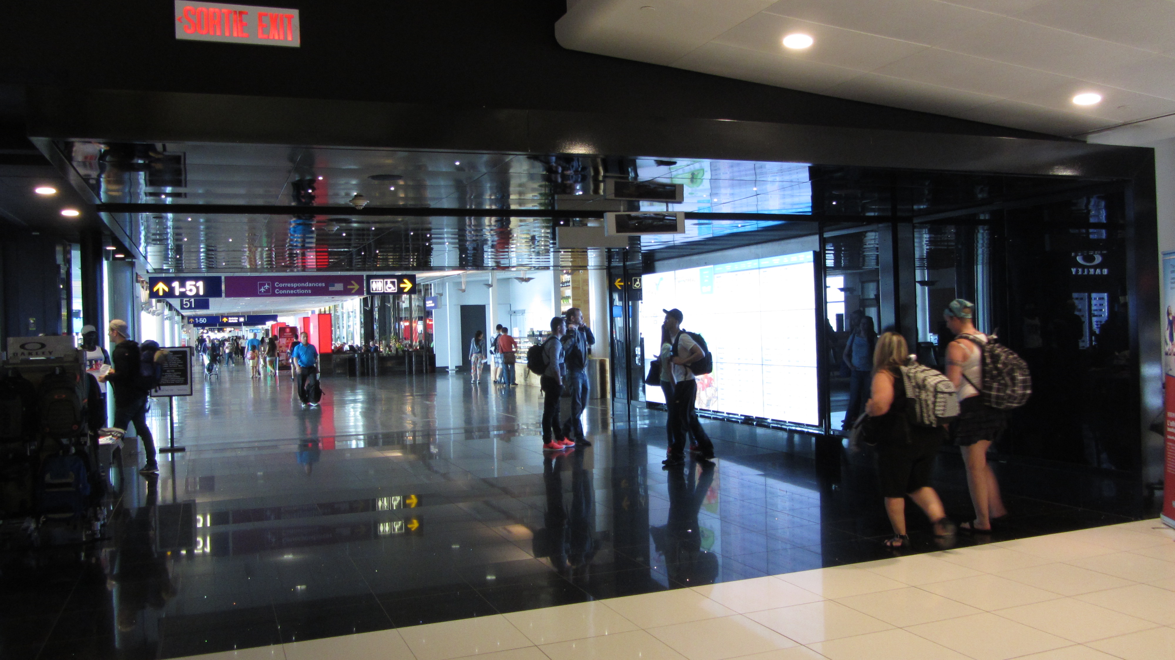 TerminalOne of the biggest duty-free shops in Canada, The Loop, seen here near gate 51. Montréal-Trudeau airport consists of one two-storied terminal, divided into four different zones: the public area (departures and arrivals level), the domestic jetty, the international jetty and the transborder jetty. There are two distinct areas in the public part of the airport (departure level); one is dedicated for the check-in of flights within or outside Canada (except U.S.) and the other one is for flights departing for the U.S. Both public areas are equipped with self-service check-in kiosks, a prayer area, shops and cafés. There is free Wi-Fi throughout the airport, luggage trolleys, ATMs and nursing rooms. When passengers arrive at Montréal-Trudeau from an international destination, they are welcomed into a huge and bright arrival complex, before passing through primary customs inspection, then go down one level to the baggage claim area and finally the international arrivals public area. The Aérogalerie program places artworks throughout the airport to showcase the city's artistic and cultural history. Works throughout the airport include showcases, illuminated columns, temporary exhibitions in the international arrival complex and permanent collection from various artists from the city. The far end of the domestic jetty on a quiet afternoon. The domestic jetty, which is accessible via security checkpoint A, is divided into two parts: a satellite jetty connected by an underground tunnel to the main terminal and a wing attached to the main terminal building. The main jetty holds 16 gates: 1 through 12, 15, and 47 through 49. The satellite jetty holds another 10 gates: 17, 19, 21, 23, 25, 27, 28, 30, 32 and 34. There are only two boarding bridges located inside the satellite (17 and 21) as the other gates are mostly used for prop aircraft like the Bombardier Dash 8 family. These parts of the airport are the only departure areas remaining that were part of the original terminal. The international jetty near The Loop. The International jetty, also accessible via the security checkpoint A, is dedicated to flights with destinations outside Canada and United States. This jetty holds 18 gates: 50 through 53 and 55 through 68. Gates 53 and 62 are used exclusively for Passenger Transfer Vehicles. In this area, travellers can shop, eat and relax with a wide varieties of boutiques, restaurants, cafés, spa facilities and one of the biggest airport duty-free shops in Canada. At the far end of the jetty, there is a wide open space with a lot of natural lights through floor to ceilings windows and a big skylight in the rooftop. The masterpiece of the jetty is a work of art, called Veil of Glass, composed of different coloured glass triangles illuminated by spotlights, created by local artist ATOMIC3. Several murals and other works of art are also located in this jetty, including four from various Montréal museums. The international jetty near gate 63. In the international jetty, there is a large area where passengers can relax before their flight. Travelers are able to download to their smartphone or e-reader the first chapter of any books available on the platform Lire vous transporte. After that, they can choose to buy the entire book through the Wi-Fi network in the airport. A rest area has been constructed near gate 57 in order to read these books in a calm environment, with cushions and dimmed lights. There are over 1000 chairs with charging stations and USB ports throughout the jetty as well as three water bottle-filling stations. The interior of the U.S. Departures wing. Lastly, there is a jetty dedicated to all U.S. bound flights, which holds 18 gates: 72 through 89. For access to gate 87, 88 or 89, passengers must go down one level via an escalator. Gate 56, 58 and 60 (part of the international jetty) can also be used for a U.S. bound flight. They can be isolated from the other gates by moving glass walls known as swing gates. Unlike other jetties, the transborder jetty requires passengers to go through security checkpoint C and then the U.S. Customs and Border Protection and lastly through the duty-free shop before accessing their gates. The gate area contains the same services as the other parts of the airport such as shops, restaurants, rest zones and cafés. If needed, some gates can be isolated in order to offer additional security checkpoints if an aircraft flies to a potential risk zone like Washington–National. Airport loungesSeveral parked planes at dusk at Montréal-Trudeau. Two major airline alliances (Star Alliance and SkyTeam) have a large presence at Montréal-Trudeau, and therefore both maintain frequent flyer lounges within the airport. There are also two "Pay-In" lounges open for use by all passengers, regardless of airline, frequent flyer status or class of travel.