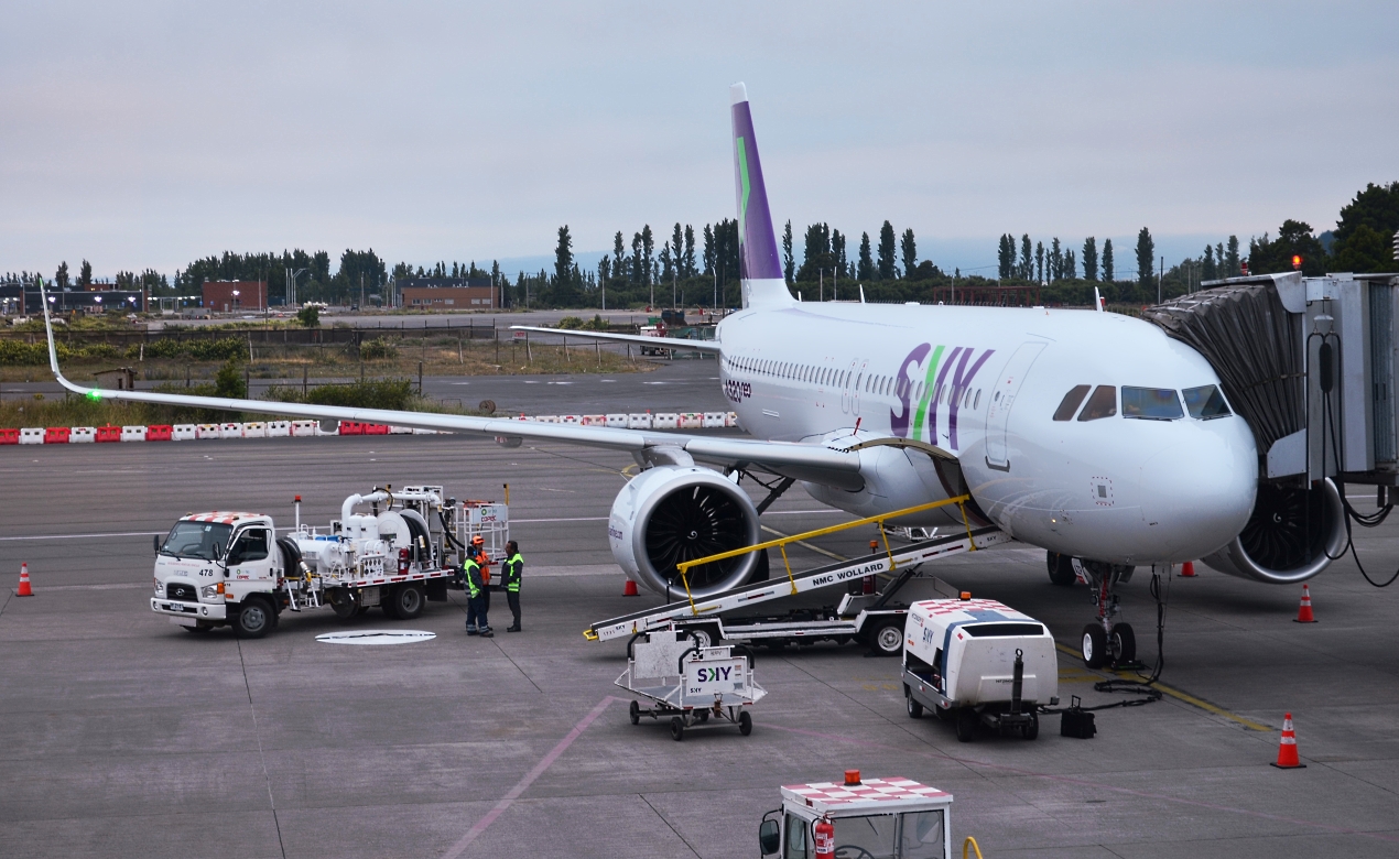 Un avión Airbus A320neo de SKY Airline en una manga del aeropuerto.