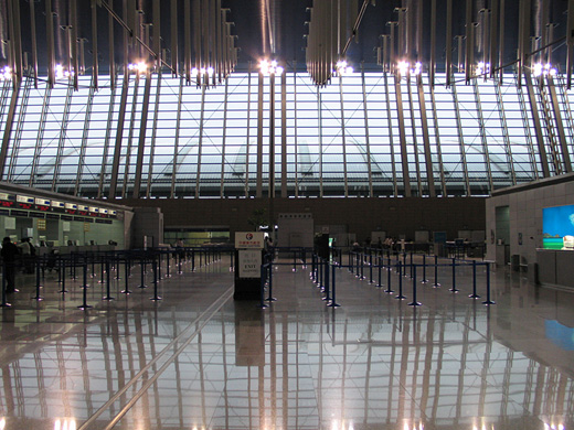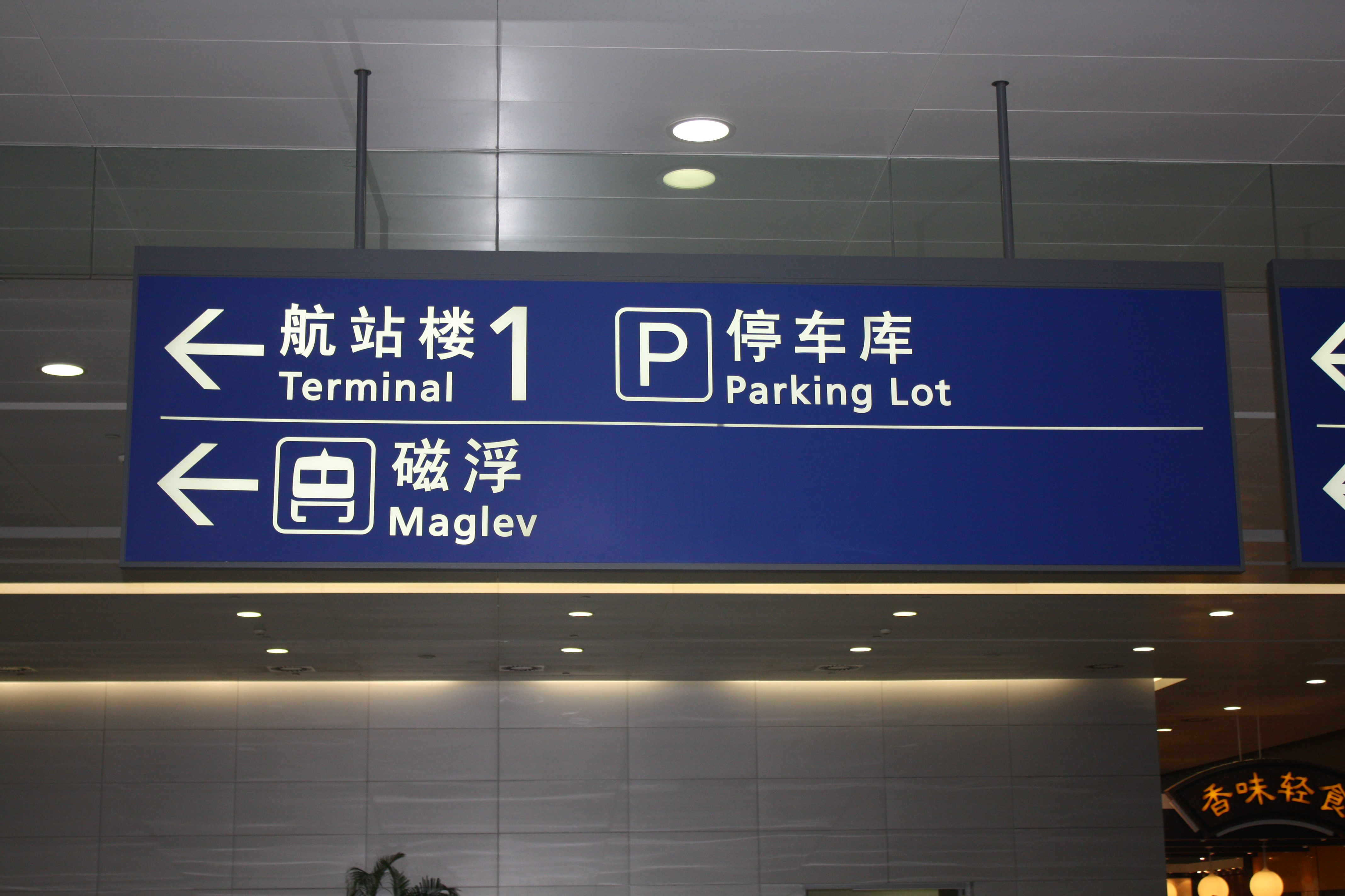 Shanghai Pudong International Airport (IATA: PVG, ICAO: ZSPD) (SSE: 600009) (simplified Chinese: 上海浦东国际机场; traditional Chinese: 上海浦東國際機場; pinyin: Shànghǎi Pǔdōng Guójì Jīchǎng) is a major aviation hub in Asia, particularly in the East Asian region, and is the primary international airport serving Shanghai of the People's Republic of China. Located about 30 kilometres (19 miles) from the city centre, it occupies a 40 square kilometres (15 square miles) site adjacent to the coastline in the eastern edge of Pudong district within the boundaries of the Shanghai Municipality. The airport is the main hub for China Eastern Airlines and Shanghai Airlines, and a major international hub for Air China. Pudong airport is organised around two main passenger terminals, flanked on both sides by three parallel runways. Current airport masterplans call for the building of a third passenger terminal, a satellite terminal and two additional runways by 2015, raising its capacity from the current 60 million passengers annually to 80 million, along with the ability to handle six million tonnes of air freight. A station for the Shanghai Maglev Train is sited between the passenger terminals, providing the world's first commercial high-speed maglev service to downtown Pudong in 7 minutes and 20 seconds. The airport is open 24 hours, one of only a few Chinese airports to be so. Shanghai Pudong International Airport is a major hub for cargo traffic in the world. With 2,539,284 metric tonnes handled in 2009, the airport is the 3rd busiest airport in the world in terms of freight traffic. A total of 31.9 million passengers passed through the airport in 2009, making the airport the 3rd busiest in mainland China. However, it handles more international passengers than Beijing Capital International Airport, currently the busiest Chinese airport in terms of total passengers handled, with 17,518,790 international passengers handled in 2007, a 9.0% increase over the previous year. HistoryEarly developmentTerminal 1 (Interior) Prior to the establishment of Pudong International Airport, Hongqiao International Airport was the primary airport of Shanghai. During the 1990s, the expansion of Hongqiao was impossible as the urban area surrounding Hongqiao was developing significantly. As a result, the government had to seek an alternative for Hongqiao International Airport to take all of its international flights. A suitable site was at the coast of the Pudong development zone to the east of Shanghai. The airport opened on October 1, 1999, replacing Shanghai Hongqiao International Airport as Shanghai's international airport and taking over all of its international flights, including regional flights to Hong Kong and Macau. The first phase of the airport began in October 1997 and took two years to build at a cost of RMB 12 billion (1.67 billion USD). It covers an area of 40 kilometers squared and is around 30 km from downtown Shanghai. The first phase of the airport has one 4E category runway (4000 m x 60 m) along with two parallel taxiways, an 800,000 m apron, seventy-six aircraft positions and 50,000 m cargo warehouse. The second and third runways were opened on March 17, 2005 and March 26, 2008 respectively, and a fourth runway is in planning stage. The second terminal was opened on March 26, 2008 and the third terminal is currently at planning stage. The master plan calls for a total of three terminals, two satellite halls, and five parallel runways, ultimately for a capacity of 100 million passengers per year. Limited international services resumed at Hongqiao Airport in October 2007 with flights to Tokyo International Airport (Haneda), in November 2007 with flights to Gimpo International Airport in Seoul, and in June 2010 with flights to Taipei Songshan Airport. This is believed to be a major effort to provide convenience to business travelers, a practice already in place between Haneda and Gimpo for years. Hongqiao, Haneda, Gimpo, and Songshan are much closer to their respective metro centers than their newer but remote international gateways Pudong, Narita, Incheon, and Taoyuan. ExpansionTerminal 2 (Interior) In 2004, the airport handled nearly 500 flights per day, carrying more than 21 million passengers per year in and out of China's most populated city. Shanghai Pudong International Airport is ranked sixth-busiest in terms of cargo traffic, and 28th in terms of in international passenger traffic. It is also ranked 40th in Passenger traffic, carrying 26,790,826 passengers in and out of the airport. It is the eighth-busiest airport in Asia in passenger traffic. Shanghai Pudong International Airport had recently experienced massive increases, thus never falling below a 10% growth rate of cargo. From 2002–2003, it had seen near double growth of cargo traffic; 87.3% in that period. From 2002–2006, it has risen from 26th place to 6th place in cargo traffic, with cargo traffic tripling since 2002. In 2006, it had a growth rate of 16.8% while Narita (Tokyo) experienced a -0.5% decrease and Incheon with an 8.7% increase. It may surpass Narita International Airport within a few years and Incheon International Airport to become fourth place in cargo and later Hong Kong International Airport, which is the busiest cargo hub in Asia and second-largest in the world. Complementing that, UPS and DHL will be adding hubs in the next few years and therefore, Pudong will become the first airport to have two international cargo express hubs. Pudong sees many aircraft movements during rush hour times, resulting in most planes having to park on the apron. To alleviate this, construction of phase two (including a 2nd terminal, a third runway and a cargo terminal) started during December 2005 and was fully complete in time for the Beijing 2008 Summer Olympics; Shanghai Airport Authority played a major role with improvement of facilities.. The architects of Terminal 2 chose to use many world-renowned int