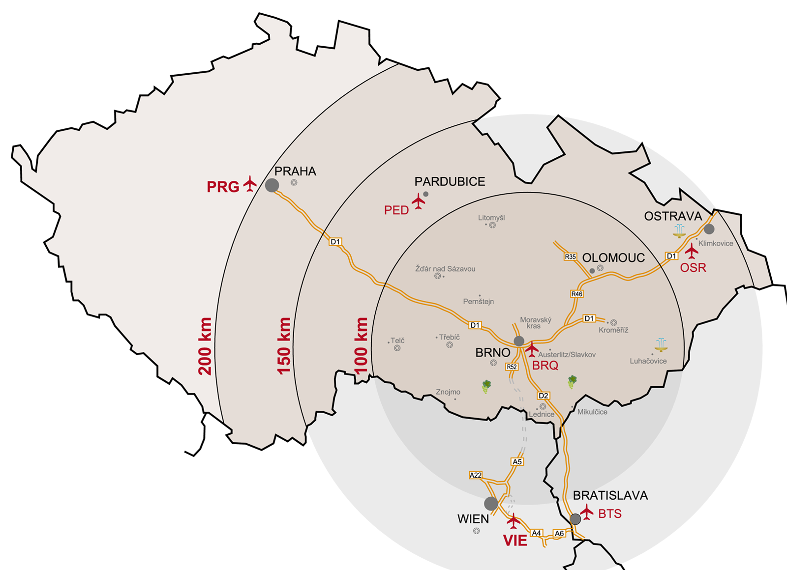 Brno-Tuřany Airport (IATA: BRQ, ICAO: LKTB) is an airport near Brno, Czech Republic. 506 174 passengers passed through the Brno-Tuřany passenger terminal in 2008, an increase of 22% on the previous year. The airport was built during the 1950s as a replacement for the old Brno airport located in Slatina (north east of Tuřany airport). During the 1980s, the airport was handed over for use by the Czechoslovak air force, and civil operations were reduced to a minimum. After the fall of communism in 1989, the airport returned to civil use, and was operated by the state owned "Czech Airport Authority". At present, the South-Moravian local government owns the airport, and it is operated by a private company, Brno Airport Ltd. Most of the flights from the airport consist of charters. The only scheduled routes are with the following airlies: CSA Czech Airlines, which operates with four times a day trips to Prague; Ryanair, which flies one daily round trip to London Stansted; and Atlant-Soyuz in a code share with Czech low-fare airline Smart Wings, which flies twice a week Moscow. There is also busy charter connection between Brno and holiday destinations in Greece, Tunisia, Bulgaria, Spain, or Egypt. The terminal consists of two concourses. New departure hall opened in 2006 is able to handle 1 000 passengers per hour. It's designed by architect Petr Parolek and is considered as one of the most significant projects of Czech contemporaneous architecture. Airport Brno is also often used by cargo airlines like TNT, Volga-Dnepr, or Antonov Design Bureau and handled 6 273 tons of freight in 2008. Plans for building new cargo terminal and industry zone will be realize in near future. Getting thereBy CarGetting to the aerodrome by car is very simple, as the aerodrome is located still within the town territory, next to the D1 Brno-Olomouc motorway. Driving in the direction from Prague, at 201 km (125 miles) there is a motorway exit marked "Slatina" and the off-turn to the aerodrome is distinctly marked. The aerodrome is 2 km (1.25 miles) from the motorway exit. By BusYou can easily get to Brno Airport from the city centre using the direct bus line No. 76 which departs from the Brno Main train station from 04:30 AM to 11:00 PM every half hour. After arrival, and before departure of the Ryanair plane to London, the bus goes every 20 minutes. From the Brno Main train station the line 76 goes through the Main Bus Station (it stops near the tram terminus) and continues directly to the final stop at Brno Airport. New bus line 89 connects Brno Airport with city centre and northwest suburb also during the night. The travel time from the centre to the airport is exactly 20 minutes. For one journey you need a 2-zone ticket valid for 40 minutes. These cost 22 CZK for adults, 11 CZK for children younger than 6 years or 80 CZK for 24 hour ticket. From Brno you can travel by regular connections directly to the 3 capitals - Vienna (Austria), Prague (Czech Republic and Bohemia) and Bratislava (Slovakia). The journeys to Vienna and Bratislava take 1.5 hours by train, to Prague 2.5 hours by bus. There are also many connections to Olomouc (1.5 hours), Ostrava and Northern Moravia (2 hours) and Eastern Moravia (1.5 hours). Airlines and destinations