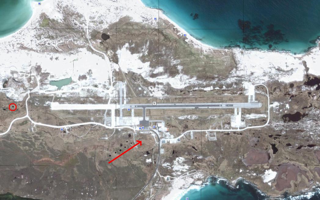 Present-day Port Stanley Airport. Craters from the Falklands War. The white extension is no longer used. |