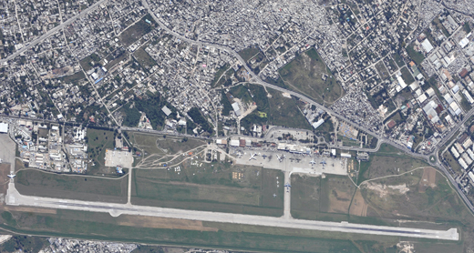 The airport in relation to the city Toussaint Louverture International Airport (IATA: PAP, ICAO: MTPP) is an airport located in Port-au-Prince, Haiti, serving as main international gateway of the country. As of January 2010 it was temporarily placed under the control of the United States Air Force, due to major international relief efforts following the Haiti earthquake. It is currently one of 2 operational airports near the epicentre of the earthquake, the other being Jacmel Airport, formally under the control of the Canadian Forces. HistoryIn the 1940s a military and civil airfield, Bowen Field, was established near Baie de Port-au-Prince providing passenger air service by Compagnie Haitienne de Transports Aériens. It served as an airbase for the U.S. military in Haiti in the 1950s and 1960s. Developed with grant money from the United States Government, the current airport opened in 1965 as Francois Duvalier International Airport, named after then Haitian president Francois "Papa Doc" Duvalier. Following the resignation of Duvalier's son and successor Jean Claude Duvalier in 1986, the airport was renamed Port-au-Prince International, before being renamed again as Toussaint Louverture International Airport in 2003, in honour of the Haitian revolutionary leader. FacilitiesThe main building of the airport works as the International Terminal. It consists of a two story concrete and glass structure. Lounges and a few retail stores are located on the second floor of the main building. Check-in counters, gates and immigration facilities are on the lower floor. The Guy Malary Terminal (named after former Haitian Justice Minister Guy Malary) is used for domestic flights. There are further buildings used for general aviation and cargo flights. The airport has 3 jet bridges, but most passengers walk onto aircraft from mobile stairs. The ramp area can handle 12 planes. AccessThe airport can be accessed by car (with parking space being located adjacent to the terminal building) or by National Bus Route 1. Airlines and destinations
