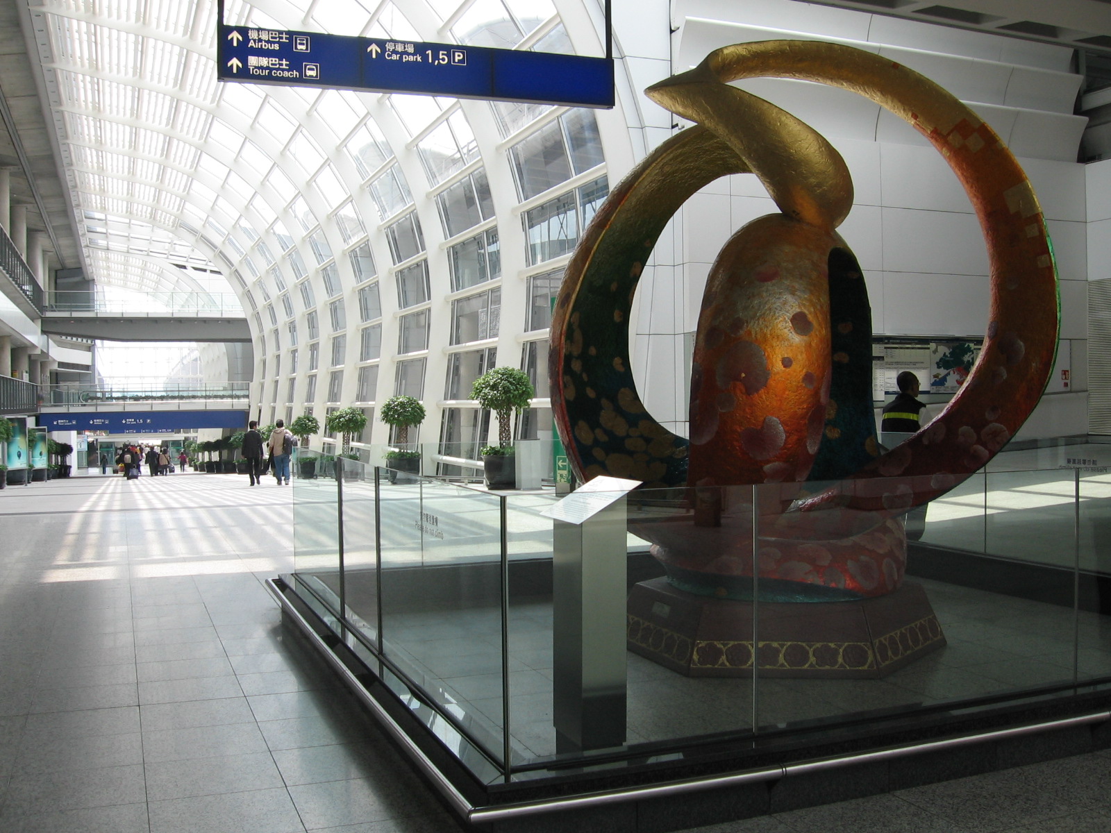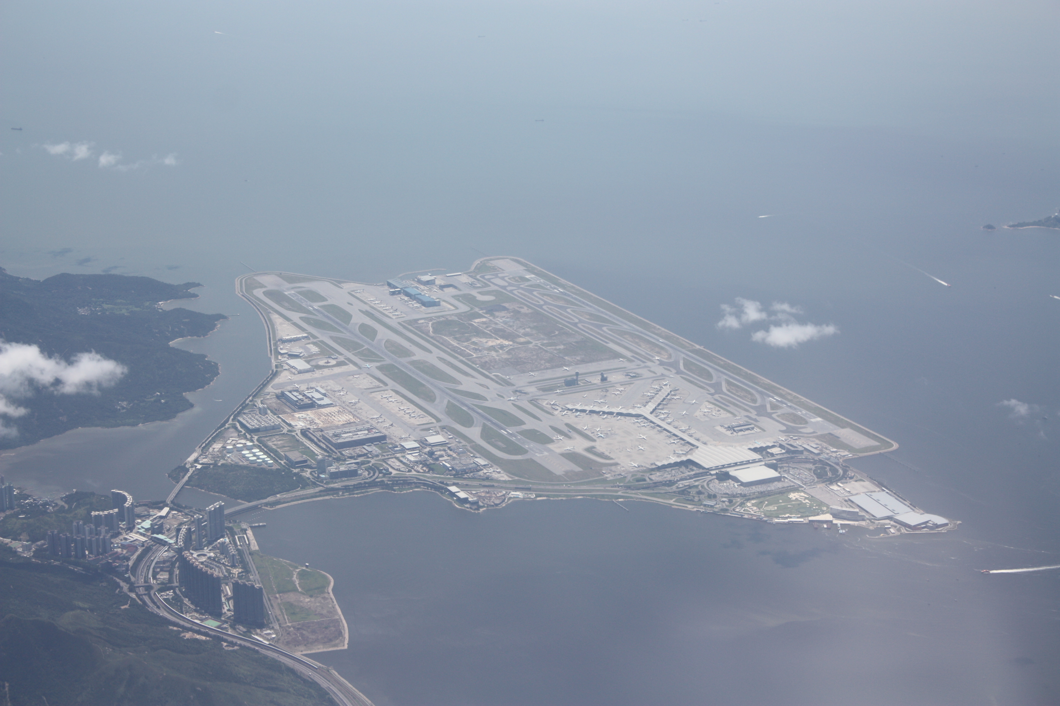 Hong Kong International Airport (IATA: HKG, ICAO: VHHH) is the main airport in Hong Kong. It is colloquially known as Chek Lap Kok Airport (赤鱲角機場), because it was built on the island of Chek Lap Kok by land reclamation, and also to distinguish it from its predecessor, the closed Kai Tak Airport. The airport opened for commercial operations in 1998, replacing Kai Tak, and is an important regional trans-shipment centre, passenger hub and gateway for destinations in Mainland China (with over 40 destinations) and the rest of Asia. Despite a relatively short history, Hong Kong International Airport has won seven Skytrax World Airport Awards for customer satisfaction in just ten years. However, HKIA ranked second and third in 2009 and 2010 respectively for the Skytrax World Airport Awards, although it still remains as the best airport taking into account passenger numbers annually. HKIA also operates one of the world's largest passenger terminal buildings (the world's largest when opened in 1998) and operates twenty-four hours a day. The airport is operated by the Airport Authority Hong Kong and is the primary hub for Cathay Pacific Airways, Dragonair, Hong Kong Express Airways, Hong Kong Airlines, and Air Hong Kong (cargo). It is a focus city for Air New Zealand to a lesser extent Qantas and Virgin Atlantic, both of which use Hong Kong as a stopover point for flights on the Kangaroo Route between Australasia and Europe. Both United Airlines and Air India use Hong Kong as a stopover point for flights respectively from the United States to Singapore and Ho Chi Minh City as well as from India to Osaka and Seoul. In the near future, Garuda Indonesia is considering making Hong Kong their transit hub for flights to Europe. Flights are operated by roughly 90 airlines to over 150 cities across the globe, and in 2009 it was the 13th busiest airport worldwide in terms of passenger throughput, registering 45,560,888. HKIA is also an important contributor to the Hong Kong economy, with 60,000 people employed at the airport. In 2009, it was the second busiest airport in the world in terms of cargo traffic, handling 3,384,765 tons of cargo. HistoryChek Lap Kok Airport was designed as a replacement for the former Hong Kong International Airport (commonly known as Kai Tak Airport) originally built in 1925. Located in the densely built-up Kowloon City District with a single runway extending into Kowloon Bay, Kai Tak had only limited room for expansion to cope with steadily increasing air traffic. By the 1990s, Kai Tak had become one of the world's busiest airports – it far exceeded its annual passenger and cargo design capacities, and one out of every three flights met delays, largely due to lack of space for aircraft, gates, and a second runway. In addition, noise mitigation measures restricted nighttime flights, as severe noise pollution (exceeding 105 dB(A) in Kowloon City) was estimated to adversely affect at least 340,000 people. A 1974 planning study by the Hong Kong Civil Aviation and Public Works department identified the small island of Chek Lap Kok, off Lantau Island, as a possible airport replacement site. Away from the congested city centre, flight paths would be routed over the South China Sea rather than populous urban areas, enabling efficient round-the-clock operation of multiple runways. Construction of the new airport, however, did not begin until 1991. The construction period was very rushed; specialists considered only a 10-20 year period was sufficient for this massive project. Another cause for this rush was due to the uncertain future of the airport construction after the transfer of sovereignty of Hong Kong to the People's Republic of China. It was originally believed that Beijing preferred to keep everything basically intact and minimise financial commitments for big projects, therefore stopping all construction despite the need for the new airport. At last, the airport did not finish in time for the Handover. However, China gave an additional year's grace period to finish the project. It was finished just in time. Hong Kong International Airport was built on a large artificial island, formed by levelling Chek Lap Kok and Lam Chau islands (3.02 km² and 0.08 km² respectively), and reclaiming 9.38 km² of the adjacent seabed. The 12.48 km² airport site added nearly 1% to Hong Kong's total surface area, connecting to the north side of Lantau Island near Tung Chung new town. Construction of the new airport was only part of the Airport Core Programme, which also involved construction of new road and rail links to the airport, with associated bridges and tunnels, and major land reclamation projects on both Hong Kong Island and in Kowloon. The project is the most expensive airport project ever, according to Guinness World Records. Construction of the new airport was voted as one of the Top 10 Construction Achievements of the 20th Century at the ConExpo conference in 1999. With one of the world's largest airport terminals, the ability to withstand an intense typhoon was a major concern. The sides of the terminals, predominantly glass, were designed to break during high speed winds, relieving pressure and allowing the terminal to remain standing. Opened on 6 July 1998, a week later than the new Kuala Lumpur International Airport, it took six years and US$20 billion to build. On that day at 6:25 am, Cathay Pacific flight 889 was the first commercial flight to land at the airport, pipping the original CX292 from Rome which was the scheduled first arrival. The architects were Foster and Partners. However, on the first day of opening, the airport had already started to experience some technical difficulties. The flight information display system (FIDS) had suddenly shut down which caused long delays. Shortly afterwards, the cargo communication link with Kai Tak, where all the data was stored, went down. In the same period of time, someone had accidentally deleted a critical database