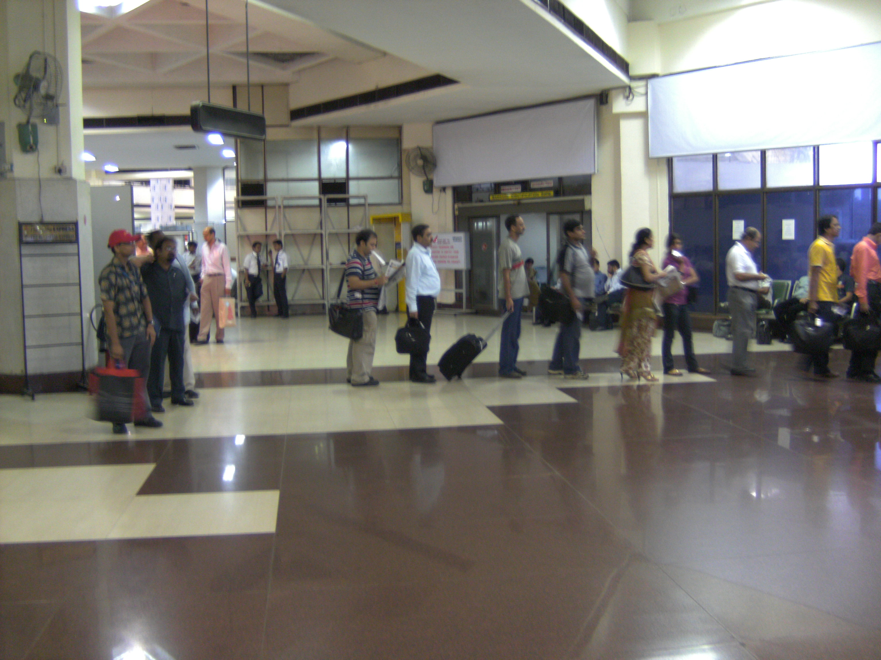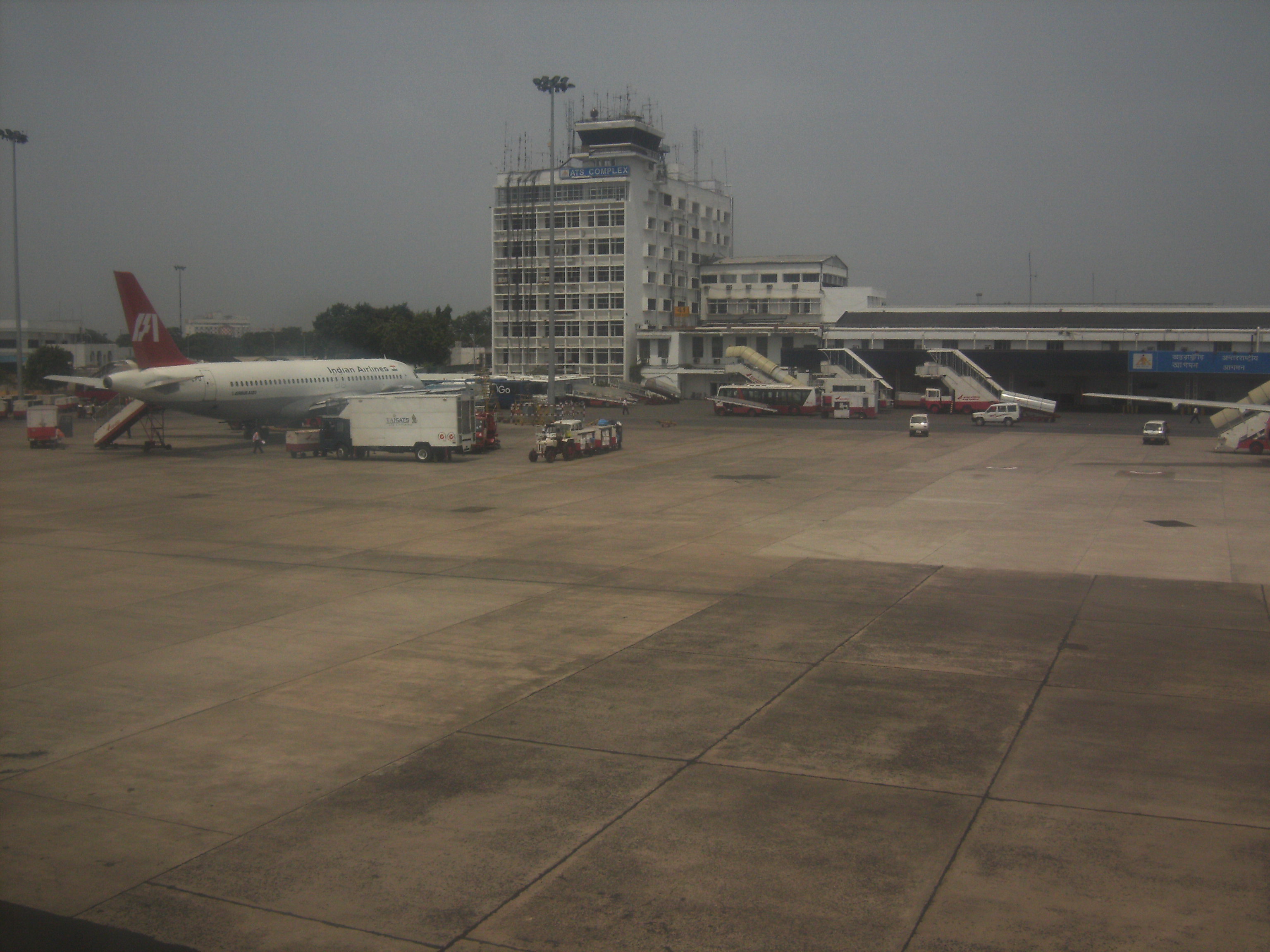 The start of the drive in to the airport, coming off Jessore Road Netaji Subhash Chandra Bose International Airport (Bengali: নেতাজী সুভাষচন্দ্র বসু আন্তর্জাতিক বিমানবন্দর Netaji Shubhashchôndro Boshu Antorjatik Bimanbôndor) (IATA: CCU, ICAO: VECC) is an airport located in Dum Dum, West Bengal, India, and serves the greater Kolkata metro area. The airport was originally known as Dum Dum Airport before being renamed in the honour of Subhas Chandra Bose. It is the fifth busiest airport in the country after Mumbai, Delhi, Chennai and Bangalore respectively, handling about 8.5 million passengers annually. It is located approximately 17 km (11 mi) from Kolkata's city centre. The airport is the largest in eastern India and one of only two international airports operating in West Bengal, the other being in Bagdogra. It is a major centre for all flights to North-East India, Bangladesh and Bangkok. Airport structureThe airport has three terminals: a domestic terminal (opened in the early 1990s), an international terminal (the oldest terminal) and a cargo terminal. It was given a major face lift in the recent past.The current domestic terminal has been extended in 2009 to cater to the increasing demand of passengers.New ticketing counters,check-in kiosks and cafes have been added.Traffic lanes have been made to cater to the inbound and outbound traffic out of the airport.The airport currently has four aerobridges (three in the domestic terminal and one in the international terminal).This will be increased to twenty once the new terminals are completed. It has two parallel runways 01/19 L/R, of which the longer one, 01R/19L is used for takeoffs and landings, while the other one is used mostly as a taxiway and for aircraft landing during daytime. The expansion of this runway is hampered by a 119-year old mosque that lies 100 feet north of the runway, within the airport property. ConnectivityThe airport is connected to the Kolkata Suburban Railway system, and is also accessible by taxi and bus. Low floor Volvo buses regularly run between the airport and the city. Recently air conditioned volvo bus services to the city have been introduced. Metered yellow cabs, Kolkata cabs, Radio cabs and Mega cabs can be availed through pre-paid procedure. The under-construction Kolkata East-West metro will be extended up to the airport. Also, a flyover is under construction to prevent traffic congestion near the airport. ModernisationThe airport is now being provided with a face-lift by the Airports Authority of India (AAI), which is currently building a fourth terminal for the airport, due to massive increase in passenger volume during the past three to four years. The modernisation plan also includes the lengthening of the runways. The airport is also linked by the suburban railway system. It handles about 360 flights a day. The increase in air traffic has forced the government to plan a second airport for the city. The Chief Minister of West Bengal, Buddhadeb Bhattacharya, is considering using the services of specialised private firms to carry out the task.A Thai-based consortium along with Kolkata-based Sikka Associates have been hired to carry out the modernisation of the airport. The existing domestic terminal building will continue to be used with appropriate modifications and façade treatment. The former airport hotel 'Ashok' has been demolished to give way to two new five-star luxury hotels and a shopping mall in its place. This will cater to the passengers and citizens alike. There has been a huge jump in the number of international passengers following recovery from recession, it is expected that the airport will handle additional 4 million passengers every year from 2012, up from 1.01 million now it handles (http://www.newkerala.com/news/fullnews-80564.html). AAI has recently added cargo-handling capacity to the airport, which is sufficient to cater to the demand up to 2015-16. In 2006-07 there were 65,687 aircraft movements of which 9,414 were international and 56,273 domestic. There has been a 25 per cent growth in international cargo movement to and from Kolkata airport and a 15 per cent increase in outward transit. Automobile parts accounted for the bulk of the growth in the movement of cargo from the city to other countries. International cargo movement to and from Kolkata airport has increased by around 25 per cent in the past year, prompting foreign airlines to add more freighters on certain routes. In November 2008 the first Centre for Perishable Cargo (CPC) in West Bengal was opened at the airport. The CPC has an area of 742.5 m (7,992 sq ft) and an annual storage capacity of 12,000 million tonnes. The CPC had been undergoing trials that started in June 2008 and was built with a Rs.67.5 million grant-in-aid from the Agricultural and Processed Food Products Export Development Authority (APEDA) part of the Commerce Ministry.. The volume of export was 21,683 ton in 2008-09, during the current fiscal more than 23,042 ton of cargo were handled by the NSCBI authorities. Similarly the volume of import cargo was increased from 16,863 ton to 18,733 ton recording more than ten per cent jump during the same period. However, in 2008-09 the total volume of cargo handled by the airport declined by 4.8 per cent from the previous year Work on a secondary runway extension, rapid exit taxiways and parking bays are in progress. The secondary runway has already been extended by 400 m (1,300 ft) on the northern side. On the south side about 1000 ft extension work is going on along with rapid exit taxi way. The secondary runway is being fitted with CAT-I facilities for night use. The primary runway is being upgraded from CAT-I to CAT-II ILS facility to help aircraft landing under poor visibility. New TerminalThe work on the new integrated terminal started in November 2008.The new integrated terminal will be an L-shaped structure wit