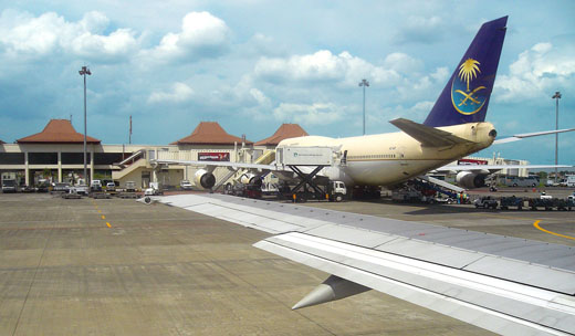 On the apron, Saudi Airlines Boeing 747 refueling and reloading to serve Indonesian Hajj pilgrims to Mecca. |