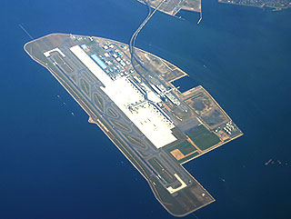 Chūbu Centrair International Airport (中部国際空港 Chūbu Kokusai Kūkō) (IATA: NGO, ICAO: RJGG) is an airport on an artificial island in Ise Bay, Tokoname City in Aichi Prefecture, 35 km (22 mi) south of Nagoya in central Japan. Centrair is classified as a first class airport and is the main international gateway for the Chūbu ("central") region of Japan. The name "Centrair" (セントレア Sentorea) is an abbreviation of Central Japan International Airport, an alternate translation used in the English name of the airport's operating company, Central Japan International Airport Co., Ltd. (中部国際空港株式会社 Chūbu Kokusai Kūkō Kabushiki-gaisha). Some 11,721,673 people used the airport in the 2006, ranking 8th busiest in the nation. 273,874 tons of cargo was moved in 2005. For the fiscal year ending in March of 2009, the above figures have dropped considerably to 10.8 million passengers. Combined international and domestic cargo figures totaled just 162,000 tons for the same year, a dramatic drop that can be largely blamed on the substantially weakened manufacturing economy since the fall of 2008 in the Aichi region. HistoryChūbu is Japan's third off-shore airport, after Nagasaki Airport and Kansai International Airport, and is also the second airport built in Japan on a manmade island. There are currently 5 offshore airports in Japan, including Kobe Airport and Kitakyushu Airport. With much lobbying by local business groups such as Toyota, especially for 24 hour cargo flights, construction started August 2000, with a budget of JPY¥768 billion (€5.5 billion, US$7.3 billion), but through efficient management nearly ¥100 billion was saved. PentaOcean Construction was a major contractor. In addition to cost cutting measures, a number of environmental protection measures had been taken after learning from Kansai International Airport. The artificial island itself was shaped like the rounded letter "D" so that sea currents inside the bay will flow freely. Its shores were partially constructed with natural rocks and sloped to aid sea lifeforms to set up colonies. During the construction a species of Little Tern occasionally came, so a part of it was selected and set aside to aid nesting. When the airport opened on February 17, 2005, it took over almost all of the existing Nagoya Airport (now Nagoya Airfield)'s commercial flights, and relieved Tokyo and Kansai areas of cargo shipments. As a replacement for Nagoya Airport, it also inherited its IATA airport code NGO. The airport's opening anticipated the Expo 2005 in Aichi Prefecture. The airport is speculated to have some competition with Shizuoka Airport, which opened on June 4, 2009. Japan Airlines (JAL) was the first airline to land an aircraft at Centrair: A Boeing 767-300ER, carrying around 206 passengers onboard a charter flight from Saipan to commemorate the opening of Centrair. FutureThe airport has undertaken airport ramp expansion in 7 locations starting in 2006, scheduled to be done in 2010. A second 4,000 m (13,000 ft) runway is planned, adding an extra 3 km (1.2 sq mi) of area, 300 m (980 ft) from the existing runway. This project is scheduled to be funded in 2008, costing ¥2 trillion (about $17 billion). There is considerable debate about the need for a second runway given reductions in both passenger numbers and aircraft movements in the last two years. Main terminalThe main terminal is shaped like a "T," with three piers radiating from a central ticketing area. This design keeps check-in distances below 300 m (980 ft). Originally, designers planned to make the main terminal resemble an origami crane from above, but this plan was abandoned due to cost. The northern side of the terminal holds domestic flights, while the southern side holds international flights, each with dedicated ticket counters, security checkpoints and baggage carousels, and for international flights, immigration and customs facilities. Arrivals are processed on the second floor, and departures on the third. The lower level is used for maintenance, catering, and other ground operations, as well as for passenger buses to hardstands in the middle of the airport ramp. Airlines and destinationsPassenger