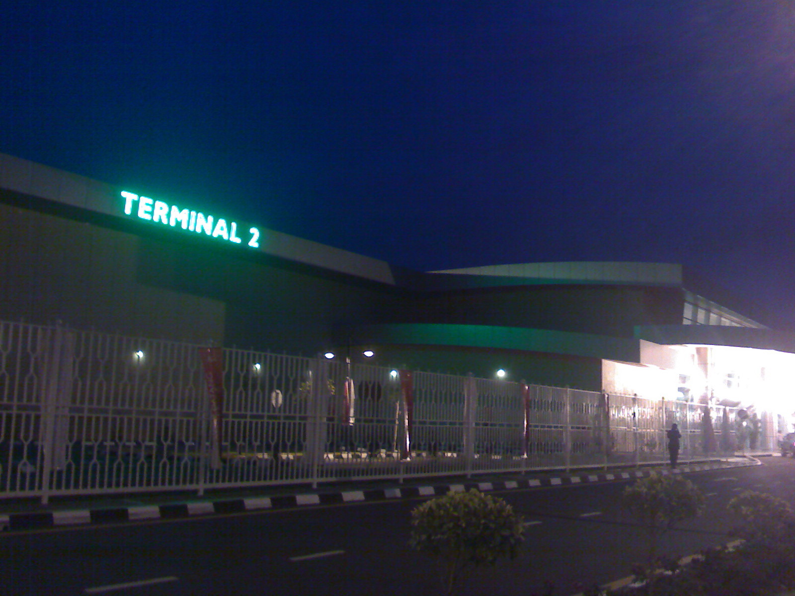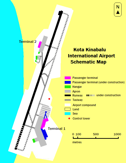 Around the 1970s to 1980s, a newer terminal building was built on the other side of the runway. Almost all commercial flights were shifted to this newer and larger terminal. From then on until recently, the original terminal became known as Airport Lama ("old airport"). In 1992, the DCA of Sabah was corporatised, and Malaysia Airports Holdings Berhad took over management and operations of the airport. Further expansion project began in 2006 for both terminals (see below), and in January 2007 the original terminal was rebranded Terminal 2, and the other became known as Terminal 1. Expansion and renovationIn mid 2005, the Malaysian government approved a project for major renovation and extension of KKIA worth RM1.4 billion. The project saw the 2,988 m (9,803 ft) runway extended to 3,780 m (12,402 ft) and the size of the main airport terminal building (Terminal 1) increased from 34,000 m (370,000 sq ft) to 87,000 m (940,000 sq ft). The new airport terminal building will be able to accommodate four Boeing 747s, one Airbus A330, seven Boeing 737s, three Fokker 50s and three Dorniers at any one time. It will also have 12 jetways for passenger use. The present air traffic control tower which is attached to the main terminal building will be demolished and will be replaced by a separate, stand alone tower. The whole project including the runway extension is scheduled to be completed by mid-2009. When the overall project is completed, the airport will be able to accommodate the Airbus A380, the world's largest passenger aircraft. The airport will also be the second largest airport in Malaysia with an annual capacity of 12 million passengers — 9 million from Terminal 1 and 3 million from Terminal 2. TerminalsTerminal 1Terminal 1 is the main terminal of KKIA located at Kepayan area. It can be accessed via Jalan Kepayan, Jalan Lintas and Jalan Putatan. Currently, the main tel is undergoing a massive renovation and expansion. When it's completed, the terminal would be capable of handling 9 million passengers annually compare to its previous capacity which is 2.5 million passengers annually. It also features duty-free shops, other shops, lounges, travel agents, restaurants, and many others. Terminal 1's new wing (phase 1) was completed and opened for commercial use on August 19, 2008 while the other wing (phase 2) was closed for renovation and is expected to complete by May 2010. It will also have a place for small aircraft passengers. After the whole terminal was completed, the first wing will be accommodating international flights while the second wing will be for domestic flights. After completion, Terminal 1 would be equipped with:
