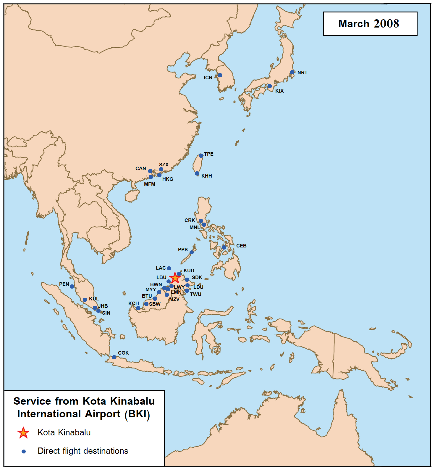 Kota Kinabalu International Airport (KKIA) (IATA: BKI, ICAO: WBKK) serves the city of Kota Kinabalu, the state capital of Sabah, Malaysia. It is located about 8 km southwest of the city centre. It is the second busiest airport in Malaysia after Kuala Lumpur International Airport, handling 4.8 million passengers in 2009. It is the main gateway into the state of Sabah and into Borneo. HistoryThe airport first began as a military airfield built by the Japanese occupying forces during World-War II. It was then known as Jesselton Airfield (Kota Kinabalu was previously known as Jesselton). Towards the end of the war, it suffered severe bombings by Allied Forces until the surrender of the Japanese army in 1945. After the war, the Department of Civil Aviation (DCA) of North Borneo (now Sabah) took charge of the operations and maintenance of the airport. In 1957, the original grass strip runway was resurfaced with bitumen material and a new terminal was built. By 1959, the runway was extended to 1,593 metres long to enable the operation of Malaysia Airways Viscount aircraft. In 1963, there was the reinforcement and further expansion of the runway to 1,921 meters long to cater for Comet 4 operations. Commercial flights and passenger arrivals gradually increased and a larger terminal building was needed to accommodate this increase. In 1969 a British consultancy firm was appointed to formulate a Master Plan for a phased and organised development of KKIA from 1970 until 2000 and years beyond. The master plan was submitted to the government with the following recommendations: