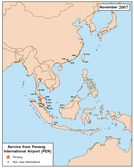 - ^1 Although some of Cathay Pacific's flights to Hong Kong stop in Kuala Lumpur, Cathay Pacific has no rights to transport passengers between Penang and Kuala Lumpur.