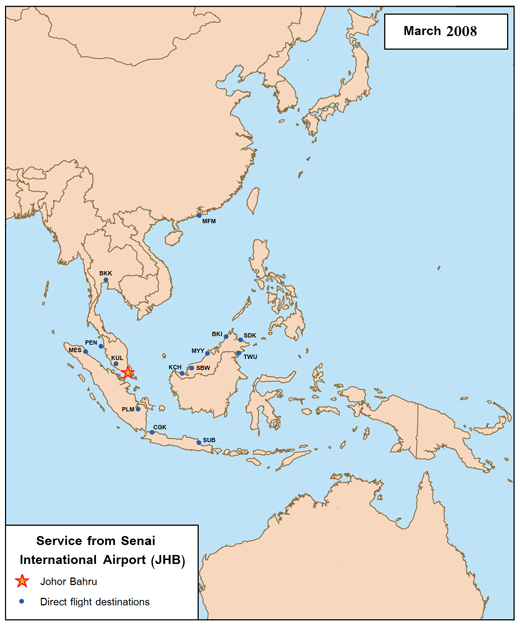 Senai International Airport (IATA: JHB, ICAO: WMKJ), officially known as Sultan Ismail International Airport (Malay: Lapangan Terbang Antarabangsa Sultan Ismail), is an airport located in the town of Senai, near Johor Bahru, Malaysia. The airport is the secondary hub for AirAsia. HistoryOpened in 1974, it serves the state of Johor as well as people from the southern states of Peninsular Malaysia. Senai International Airport is one of the four Malaysian hubs of AirAsia, the other three hubs being Kuala Lumpur International Airport, Kota Kinabalu International Airport and Penang International Airport. Senai International Airport used to serve as a domestic hub of Malaysia Airlines until the rationalisation of its domestic routes to cut the company's losses. As a result, Malaysia Airlines now only serves two destinations from Senai. Today, this airport is managed by Senai Airport Terminal Services Sdn Bhd (SATS), the first independent airport operator in Malaysia, after taking over the operations of the airport from Malaysia Airports Holdings Berhad (MAHB) in 2003. Senai International Airport is able to handle up to 4.5 million passengers and 100,000 tonnes of cargo per annum. There are plans to increase the capacity of the airport to 10 million passengers in the long term and turn the airport into a cargo hub. Recent expansions and upgrades include lengthening of the runway to 3800m and building a parallel taxiway to increase runway capacity. Growth potential of Senai AirportOpened in 1974, the airport's main purpose was to prevent the "leakage" of passenger and cargo traffic from Johor into Singapore. However, the airport has never fulfilled its purpose due to the limited number of flights and airlines at the airport. With the South Johor region being developed, Senai International Airport has the potential of becoming a major hub in Malaysia. Located strategically in the Iskandar Malaysia, Senai International Airport is set to become a major hub in the future. As such, Senai Airport Terminal Services (SATS) plans to invest up to RM1 billion over the next few years to upgrade the airport's passenger and cargo facilities such as building a new cargo centre and increasing the airport's retail space. Since Senai Airport was bought over, passenger traffic at the airport has more than doubled in the recent years and cargo traffic increasing significantly. The number of flights at the airport has also doubled due to efforts to attract new airlines and getting existing airlines to increase flights. Qatar Airways Cargo, which started weekly cargo flights to Senai International Airport, plans to double the number of weekly flights to two due to high demand for its service with 80% of the cargo continuing on to Europe. Also, SATS wants to take advantage of the proximity of the airport to Singapore to attract people in Singapore to use Senai Airport. It has recently completed the building of the City Lounge, located at the Kotaraya Bus Terminal. The City Lounge provides bus services to the airport, city centre and Kranji MRT Station in Singapore, thus increasing the accessibility of the airport. From Singapore, one may take a public bus service or 'restricted' taxi to Kotaraya Bus Terminal. From the bus terminal, one can change to an express bus service provided by the airport to get to Senai airport. However, if one does take a public bus over the Causeway, it is extremely inconvenient for someone with luggage since there is a need to disembark and re-board the bus on both the Singapore and Malaysian sides of the border to pass immigration and customs which is one level up from street level. If one makes the trip in both directions, it is twice the hassle. No porters or luggage trolleys is provided. Also, there is currently a minimal amount of domestic flights from Senai. In order to attract more Malaysians and Singapore residents, SATS plans to have a wider range of direct flights to major cities such as Hong Kong, Guangzhou, Taipei, Shanghai, Perth, etc. However, efforts to attract other Asian budget carriers to fly some of these routes have so far been unsuccessful. Singaporeans currently make up about 40% of the passengers using the airport. Under future plans, a new KTM mainline railway station is to be located at the airport, helping to increase ground interconnectivity for the airport's passengers. Currently, no rail service is provided at the airport. Expansion and Future PlansSenai Airport Terminal Services Sdn Bhd, the operator of the airport announced a multi-billion ringgit project called Airport City or Aeropolis. The project, on 1,133 hectares near Senai Airport, will comprise three main components – residential-commercial-hospitality amenities, an air cargo logistic centre and a hi-tech park. The first component will cover 323 hectares while the other two will occupy 405 hectares each. On 26 May 2008, SATS announced a MYR 70 million plan to build an Aero Mall, a stand-alone and external airport mall. The mall will have a retail space of 10,000 square feet (930 m) and is due to be completed in the late 2009 / early 2010 time frame. The Aero Mall was official opened in July 2010. On 8 July 2008, Kuwait's Al-Aqeelah announced a project to build an aviation academy near the airport. The project will cost around USD 100 million. On 12 February 2009, the Hong Kong-based Plaza Premium Management Ltd opened its third Plaza Premium Lounge in Senai International Airport. Since December 2009, the airport provides free WIFI service for all customers at the Main Terminal and Cargo Centre. Airlines and destinationsPassenger Carriers