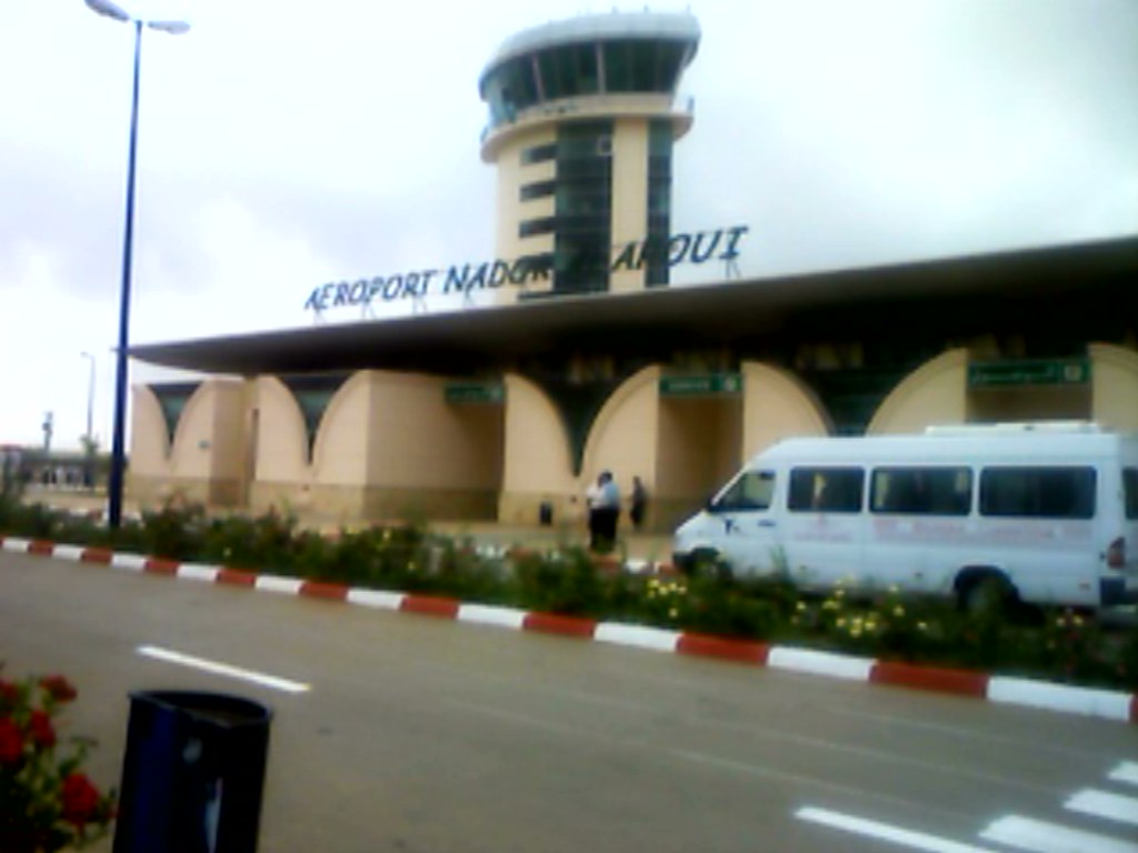 Nador International Airport (Arabic: مطار الناظور العروي) (IATA: NDR, ICAO: GMMW) is an airport serving Nador, a city in the Oriental region in Morocco. It is also known as Al Aroui International Airport. Nador is a small international airport with links to Morocco's main airports and some European destinations (Germany, Netherlands, Belgium, Spain). It is relatively busy airport during summers as many Moroccan nationals living in Western Europe and originating from Nador region (mainly the Riffian Berbers) travel through it. The Nador airport is owned and run by the state as all other Moroccan public airports (ONDA). It is exploited mainly by the Royal Air Maroc company and its subsidiary Atlas Blue. It is also used by people visiting the neighbouring Spanish city of Melilla. In the year 2009 the airport handled over 307,000 passengers.. Terminal and passenger facilitiesNador International Airport has a single terminal, divided in arrivals and departures, both on the ground floor and sharing the public/open area with basic facilities as a coffee-shop, snack-corner and small shop. Check-in terminals are located at one side of the main terminal hall, while the other side is for the baggage check for arriving customers. After passport control there is a waiting-room, a smoking-lounge and a small room for praying. The tax-free shop is closed. On boarding you leave via controlled doors and walk to the plane. Outside the terminal building there is a paid parking lot and -on arrival of a scheduled flight- taxis are available for connection to Nador and other locations. No other forms of public transport are available. Airlines and destinations
