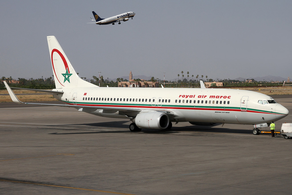 Marrakech-Menara Airport - A Royal Air Maroc Boeing 737-800 at the airport in 2013. A Ryanair aircraft is departing in the background
