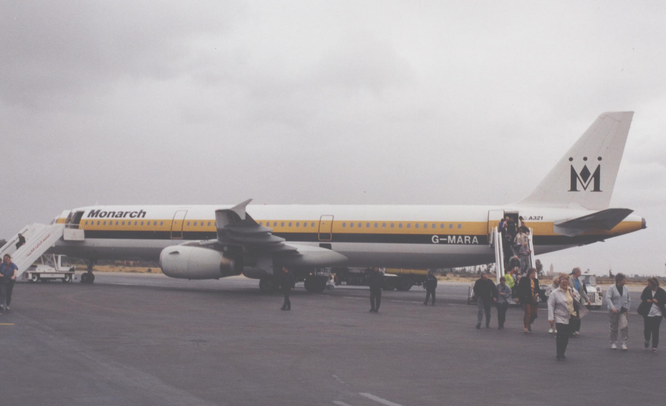 Passengers leaving an Airbus A321 of Monarch Airlines on a charter flight from Manchester at Menara airport in 2000 |