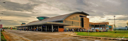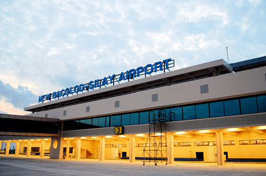 The airport's control tower Bacolod-Silay Airport (Filipino: Paliparan ng Bacolod-Silay, Hiligaynon: Hulugpaan sang Bacolod-Silay) (IATA: BCD, ICAO: RPVB) is the main airport serving the general area of Bacolod City, the capital city of Negros Occidental in the Philippines. This airport replaced the Bacolod City Domestic Airport, located in Bacolod City proper, in 2007. The New Bacolod-Silay Airport inherited its IATA and ICAO airport codes from the former. The airport is located fifteen kilometers northeast of Bacolod City on a 181-hectare site in Barangay Bagtic, Silay City. The airport, which is built to handle international traffic, is expected to become the primary gateway to Negros Island, and one of the three international airports envisioned to serve the Western Visayas region, alongside Kalibo International Airport and the New Iloilo Airport. Despite being built to international standards, the Bacolod-Silay Airport is designated as a Principal Class 1 domestic airport by the Civil Aviation Authority of the Philippines, a body of the Department of Transportation and Communications that is responsible for the operations of not only this airport but also of all other airports in the Philippines except the major international airports. To date, scheduled commercial international flights are yet to serve the airport. HistoryPlanning for a new airport in Bacolod City commenced in 1997, when the Japan International Cooperation Agency initiated a study indicating the need for expansion at four Philippine airports: namely Bacolod City Domestic Airport, Mandurriao Airport in Iloilo City, Legazpi Airport in Legazpi City and Daniel Z. Romualdez Airport in Tacloban City. Of the four airports, two have been completed (Iloilo and Bacolod), and two are in planning (Legazpi and Tacloban). In February 1999, another JICA study was commissioned, this time on the detailed plan of the new airport. The study was completed by March 2000 and was funded by a 430-million yen grant. Immediately after the completion of the study, JICA hired Pacific Consultants International as advisers to the project. The project was opened for bidding on August 25, 2003, with the winning bid going to the Takenaka-Itochu Joint Venture (TIJV). Physical construction on the new 4.3 billion-peso airport, funded in part by an 8.2-billion yen loan, commenced in August 2004. A 900-day deadline was imposed for the airport to be completed, which broadly corresponds to January 2007. The airport was complete as of July 16, 2007, although there was considerable debate over whether or not the airport should be opened due to the length of its runway. A 500-meter extension of the runway was planned in order for the airport to accommodate larger aircraft. Depending on the scenario, the airport had a foreseen opening date of November 2007 or sometime in 2010, after the completion of a diversion road leading to the airport. The first aircraft ever to land at the airport was a small fourteen-seater turboprop owned by Vincent Aviation. The Reims-Cessna F406 with aircraft registration number ZK-VAF, piloted by Steve Gray of New Zealand landed at the airport at 9:55 in the morning of September 26, 2007. The airport officially opened and began operations on January 18, 2008, and the first commercial flight to arrive was Cebu Pacific's Flight 5J 473 from Manila, an Airbus A319-100 which landed at 5:22am PST on the same day. Fittingly enough, the pilot in command of the aircraft - Captain Allan Garces - was a native of Silay City. The first international flight to arrive at the airport was a chartered plane from Kazakhstan which landed on January 2, 2009. StructureRunwayThe Bacolod-Silay Airport has one primary runway 45 meters (148 ft) wide and 2,000 meters (6,600 ft) long, just a bit longer than its predecessors. The runway runs in a direction of 03°/21°, and can currently handle aircraft as large as the Airbus A330. Provisions for a 500-meter (1,600 ft) expansion of the present runway in order to accommodate even larger aircraft like the Boeing 747 and the Airbus A340 were confirmed on May 23, 2009, when it was reported that the budget for the construction of the 500m extension of the runway has been approved by the Philippine government, and bidding and construction is slated to start in the 3rd or 4th quarter of 2009. The airport is equipped with an Instrument Landing System, making it capable of handling night and low-visibility landings. Passenger terminalThe entire airport complex is designed to handle an excess of one million passengers and 16,715 tons of cargo annually and consists of 21 buildings with a total floor space of 10,075 square meters (108,450 sq ft). The largest building in the complex is the 6,187-square-meter (66,600 sq ft) main passenger terminal with three levels. The ground floor holds the check-in counters, the public concourse, the arrival area and the information counter. The second floor has the three pre-departure areas with their VIP and CIP lounges; these pre-departure areas lead out to three jet bridges over an apron that can handle up to five aircraft simultaneously. The Air Transportation Office is also on the second floor, as well as the Airport Security holding room, a clinic and a nursery. On the third floor is the viewing deck with a concession area and rooms for maintenance and airport machinery. The state-of-the art main passenger terminal is equipped with a flight information display system, mechanized baggage handling systems for both inbound and outbound baggage, numerous security X-ray machines, and elevators and escalators. Outside the main terminal is parking for 350 cars. Airlines and destinations